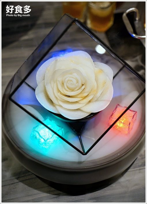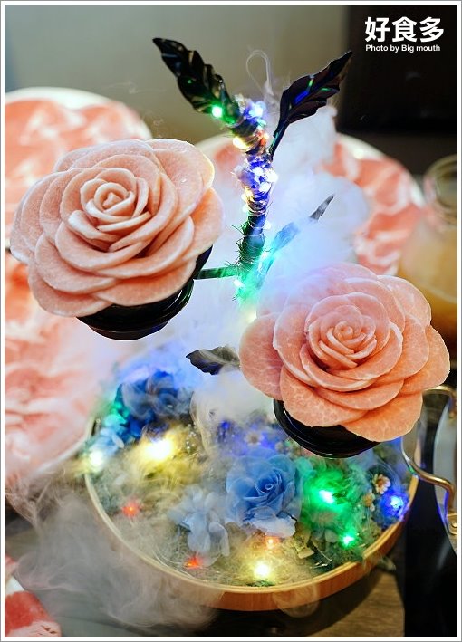▼光是這兩朵玫瑰松阪豬花一上桌就讓人驚呼連連,連鄰桌客人也都為之嘆讚啊!玫瑰松阪豬花得花上好一段時間塑型,費時費工,加上燈飾、音樂、乾冰一起出場,根本就是一個充滿仙氣的松坂玫瑰花音樂盒啊!