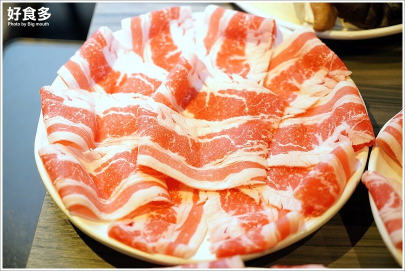 ▼另一份則是贈送的豬肉,同樣也是份量多多(一共有兩盤),涮煮至全熟後,吃起來香Q甜美,不僅一點也不柴,搭配麻辣湯頭更是超美味!菜盤,裡頭也放有不少當季時蔬、菇類還有豆腐等配料,算是非常有誠意,吃這麼多肉也要來點蔬菜解膩一下!