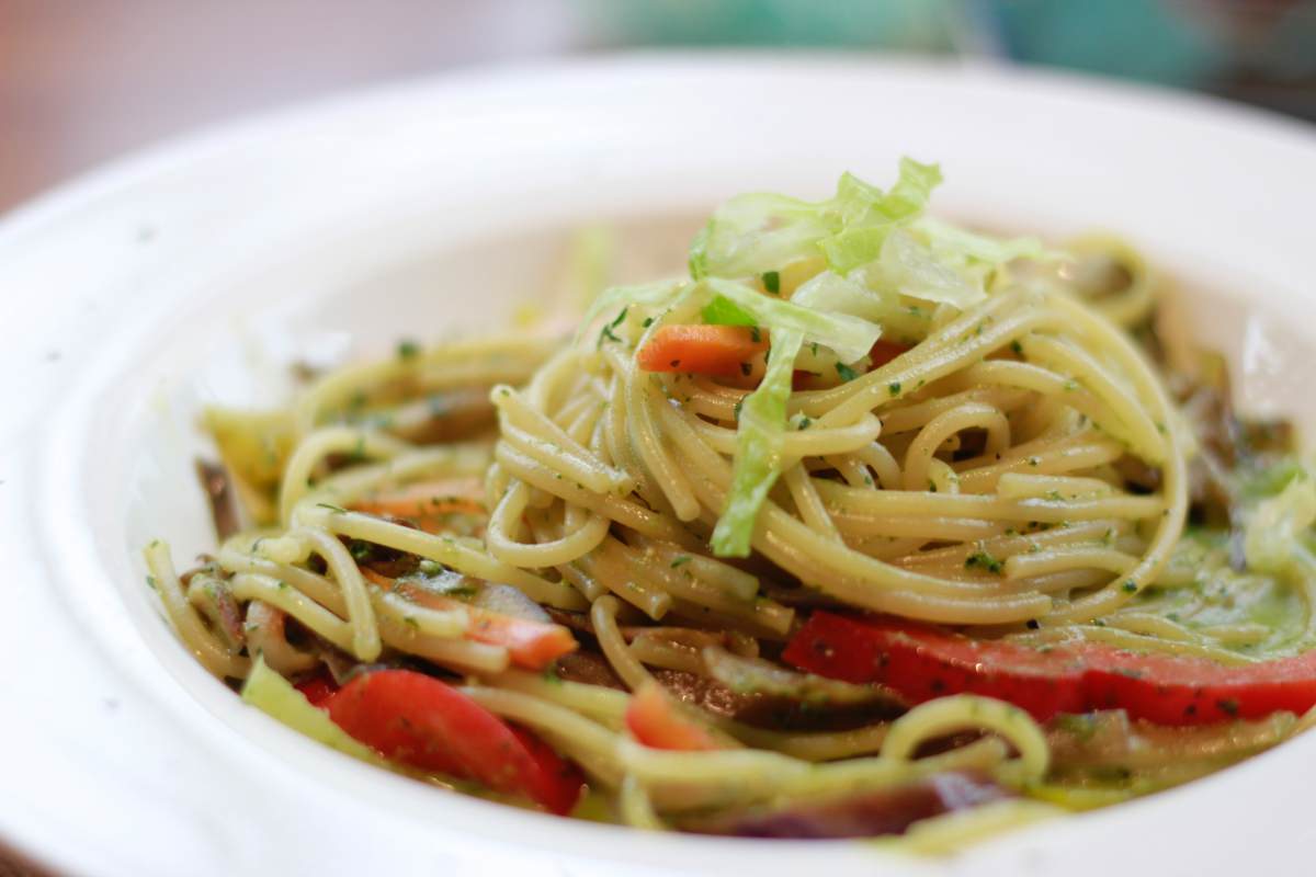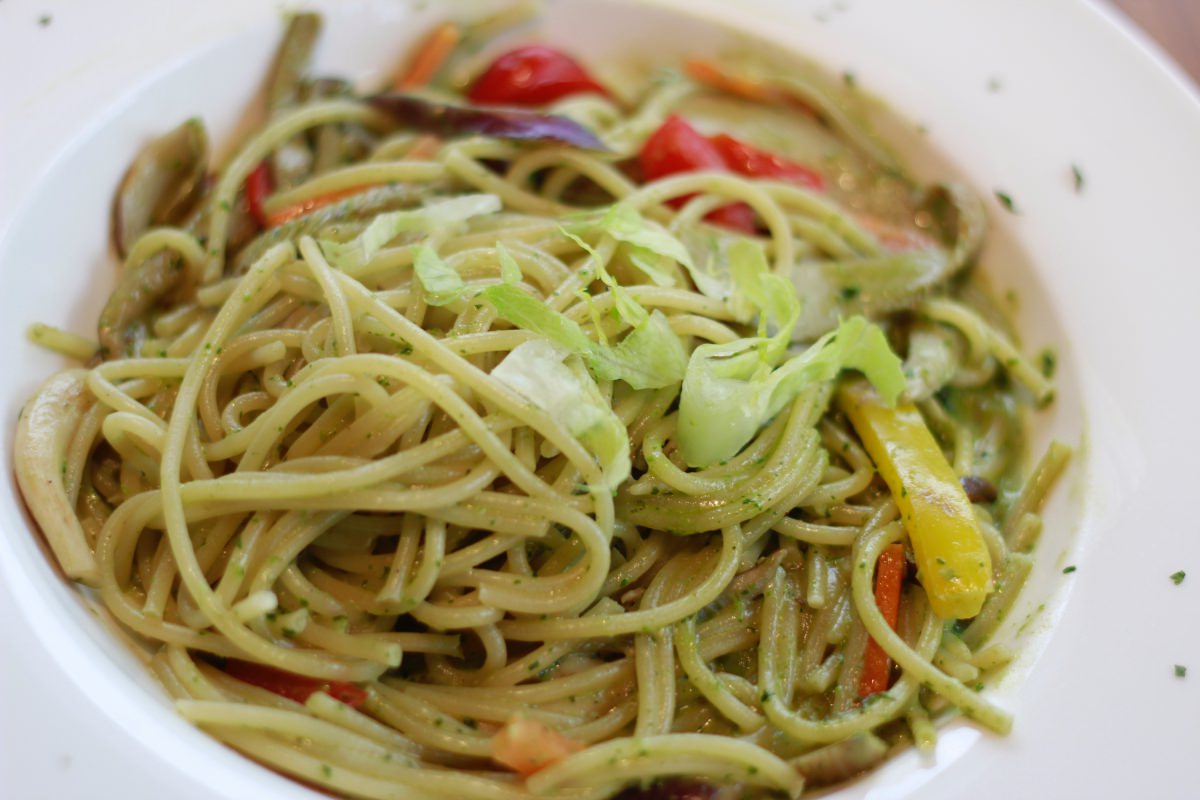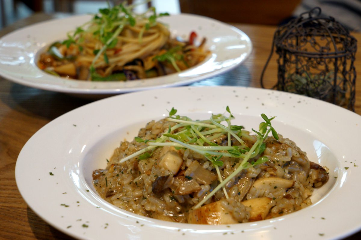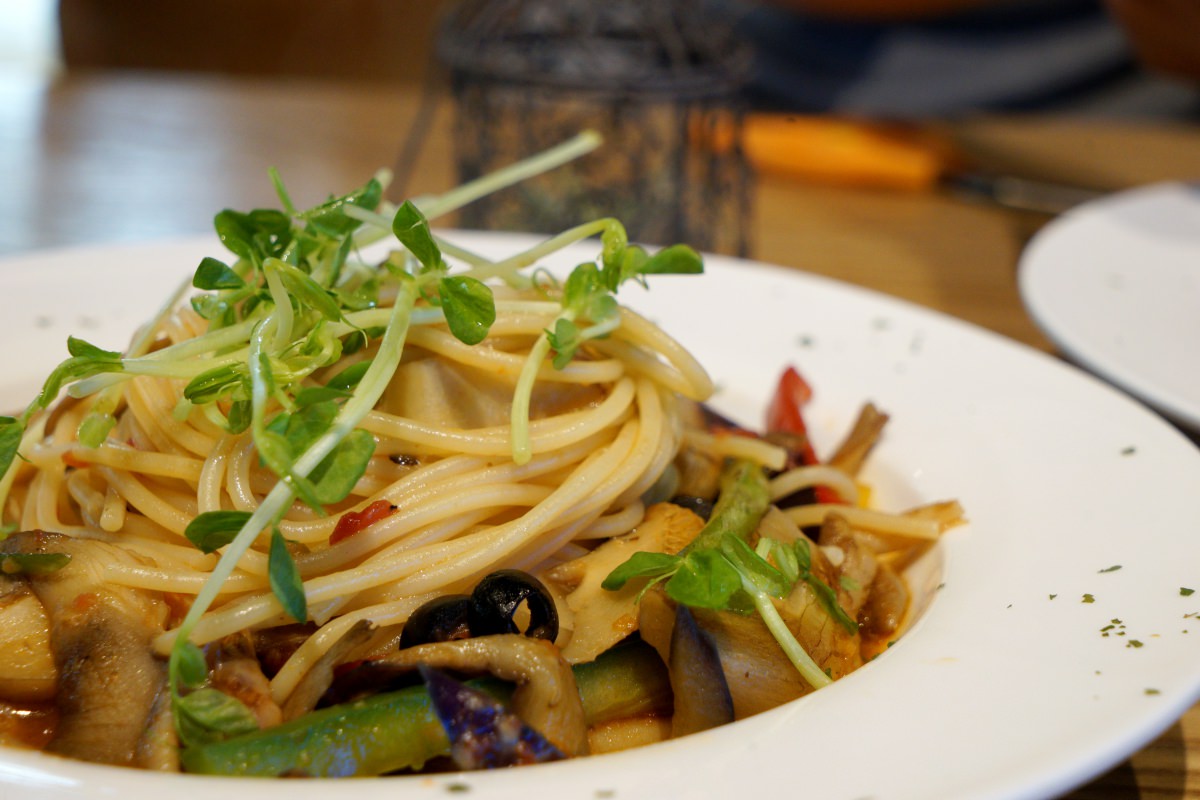 樂農匯的蔬食料理大多是蛋奶素,應該是屬於剛剛講的第二種,健康素。餐點的類型有義大利麵、披薩、燉飯,但也有漢堡、薯條、比利時鬆餅,整個是義式與美式的混搭。