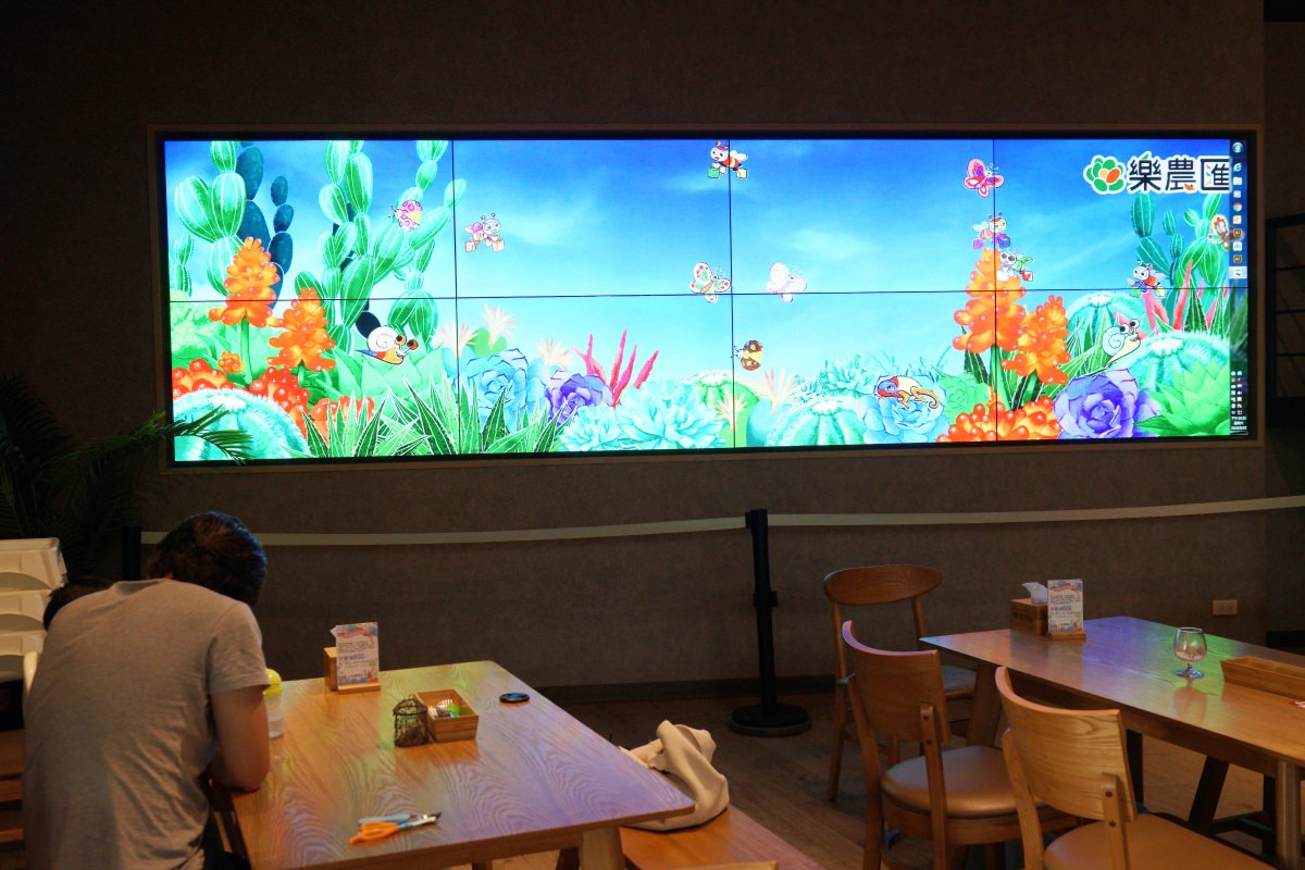 這樣就結束了嗎?沒有哦,樂農匯還有一個很奇妙的地方,就是它的那片電視螢幕。這片電視螢幕叫做「多肉蟲林」,上面有蝴蝶、瓢蟲、變色龍走來走去,如果點餐滿600元還可以獲得蟲林塗鴉紙,你只要在塗鴉紙上彩繪,服務生就可以把彩繪的成果投到電視螢幕上與大家分享,成為多肉蟲林的一份子。這兩次去樂農匯都發現阿福超愛的,可以在那裡看好久。但是我們其實還是有點擔心小孩子視力怕無法承受那麼強的光線,會引導他不要盯太久。整體說來,這個設計還是挺有趣的。