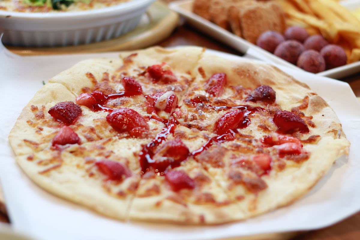 披薩餅皮是十吋大小的薄片,口味有基本款的夏威夷、瑪格麗特、黑橄欖田園,也有煙燻乳酪、羊奶乳酪這種比較強調奶香味的可以選擇。但最特別的是,提供了巧克力與草莓這兩款,說實在我們自己是不會想去點這兩道,但這次有小朋友主動點了草莓口味的披薩,所以才有緣嚐嚐。好不好吃呢?答案可能見仁見智,我個人是覺得披薩餅皮與草莓的氣味不搭。