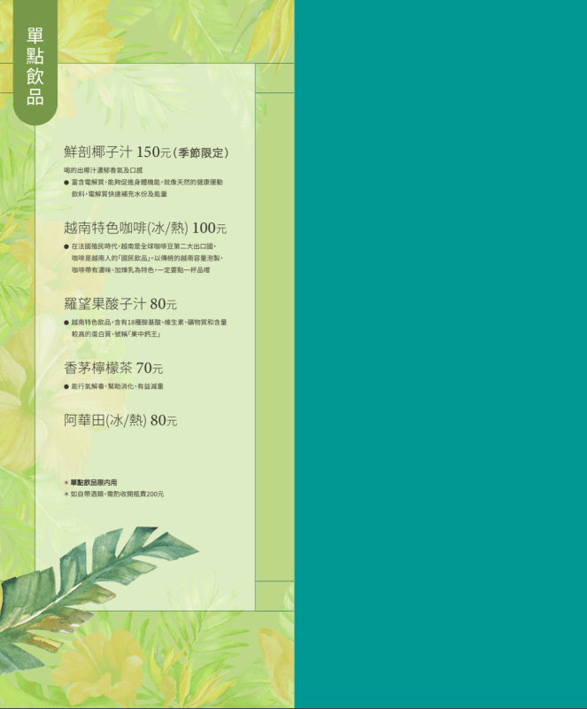 以熊的感受來說,羅望果酸子汁口感非常開胃,說真的蠻適合搭配厚實的湯頭,而香茅檸檬茶(70元,杯)刺激感不高,即使有點怕香茅刺鼻感的朋友也能輕鬆接受。