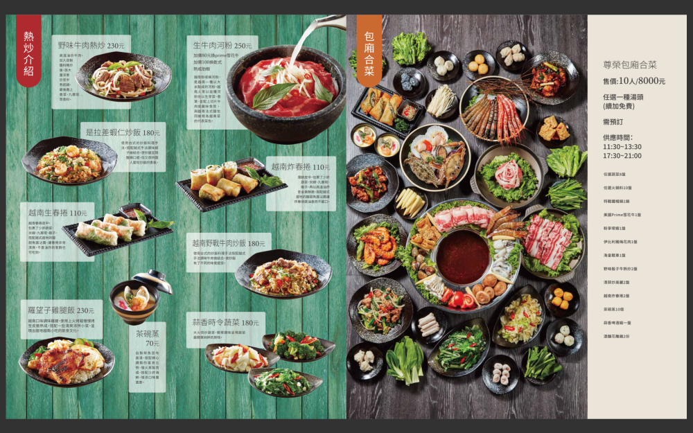 但沒想到,在這裏居然還能吃到越式生春捲、越南炸春捲、生牛肉河粉、羅望子雞腿飯等越式風味小吃,所以如果是搭配鐵帽鍋與海皇戰車海鮮盤,再加上粉享吃蝦盤與美國Prime雪花牛及伊比利豬等主菜,還有蔬菜盤與鍋料及熱炒,就成為8000元的十人包廂合菜(800元,人)