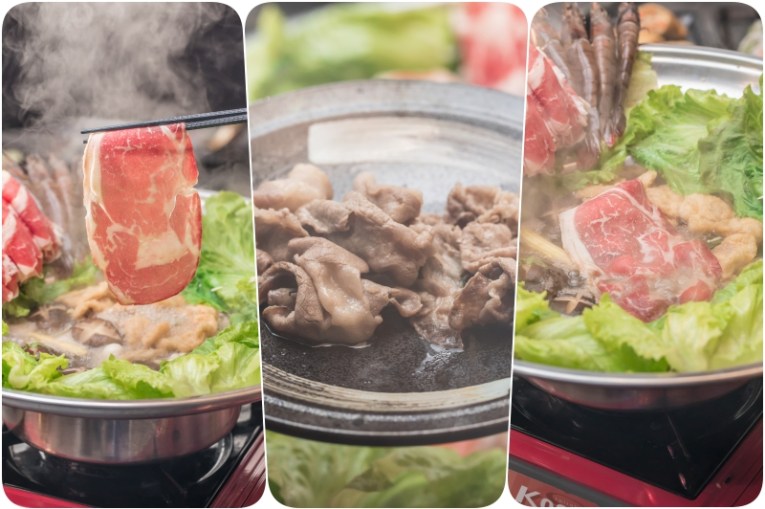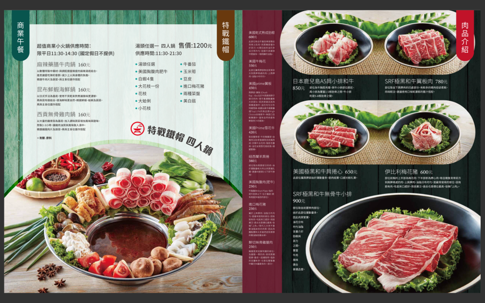 以鐵帽鍋來說,套餐裡面包括美國胸腹肉肥牛跟梅花豬,還有白蝦跟花枝、蛤蜊跟各式蔬菜與豆皮等內容。而個人粉鍋則是先挑肉品或海鮮當主菜,然後湯頭五選一,配菜部分則是附時令青菜二份跟越式河粉、越式米粉、白飯、科學麵主食四選一。