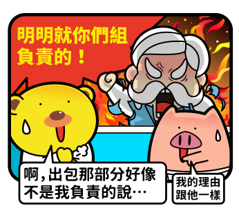 第二招也沒用的話,那就只好把隊友推出來了,畢竟出包有時可大可小,不小心工作都不保了…這時也只好親兄弟明算帳了…。