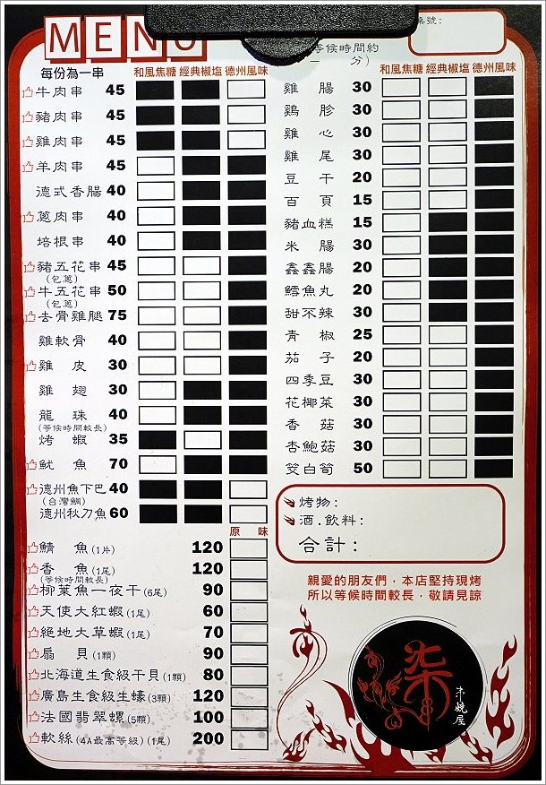 ▼菜單,這裡的餐點價位相當平實,從15~200元不等,以台北店面來說算是非常實惠了!特別的是他們一共有提供和風焦糖、經典椒鹽、德州風味三種風味的醬料,口味吃起來跟其他串燒店也更加不同啦!另外海鮮都是以原味為主,就是希望客人能夠吃到高品質、新鮮的海鮮食材,而不要被過多的醬料給遮蓋原有的風味,喜愛海鮮的朋友必點!