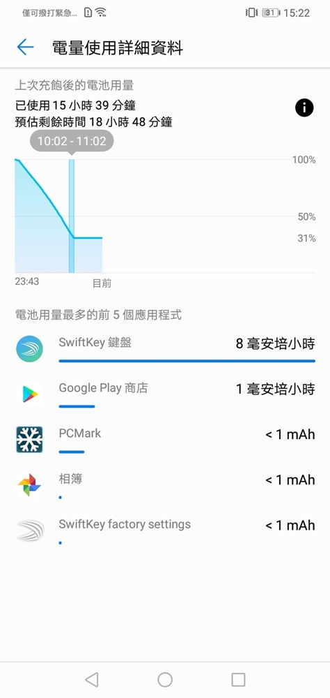 從電池使用詳細資料可以看到,從 23:43 分開始使用 PCMark 測試電力消耗,在 11:02 分左右中斷時,雖然過了 11 個小時多,電量仍有 30%。