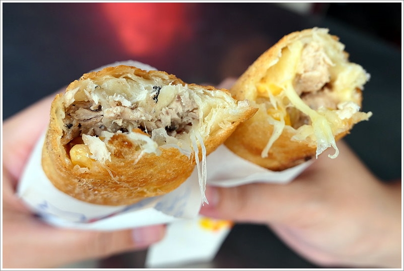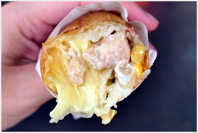 ▼只見小口愛一咬就有長長的牽絲,可見起司下超多,絲毫不手軟啊~雞肉起司捲裡頭的配料滿滿,除了起司之外,還有洋蔥、玉米及雞肉塊,吃起來外皮非常薄酥,裡頭料多實在,帶點黑胡椒香氣與洋蔥、玉米的香甜,搭配軟嫩香Q的雞肉塊非常對味!