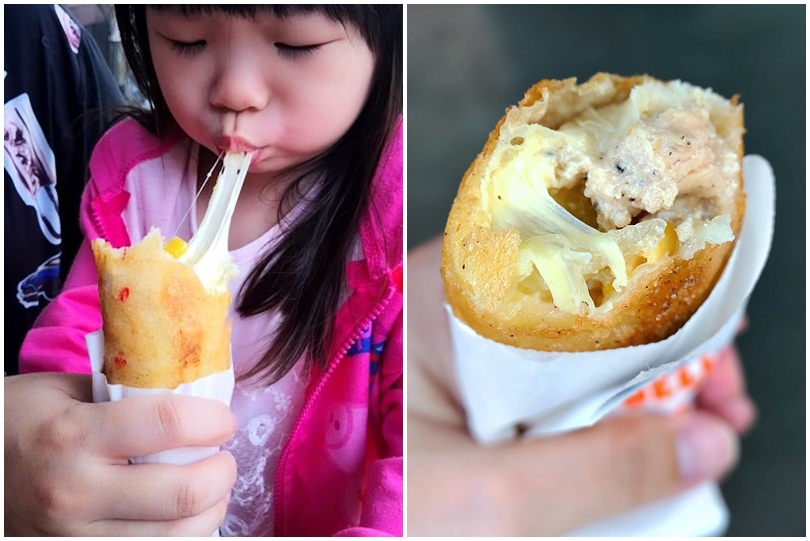「YOYO起司捲」不僅料多實在,薄酥的外皮搭配滿滿起司、玉米、洋蔥與雞肉(或鮪魚),帶點微微鹹香、黑胡椒香氣的滋味非常迷人,尤其那濃厚的起司香味更是讓人魂牽夢縈啊!且他們家的起司捲吃起來不會過於油膩,大人小孩都喜歡~大口是覺得兩間的美味程度其實差不多,大概就是85、87分左右的差別,如果排不到小蝌蚪的朋友,不妨也可以來吃吃看這間「YOYO起司捲」,同樣也會讓你一吃就愛上唷!