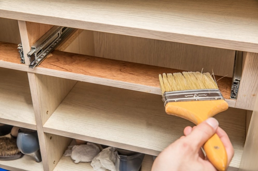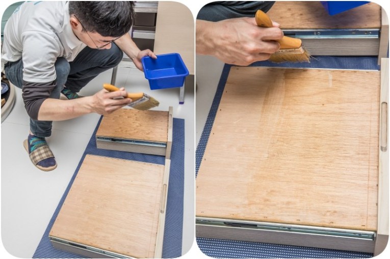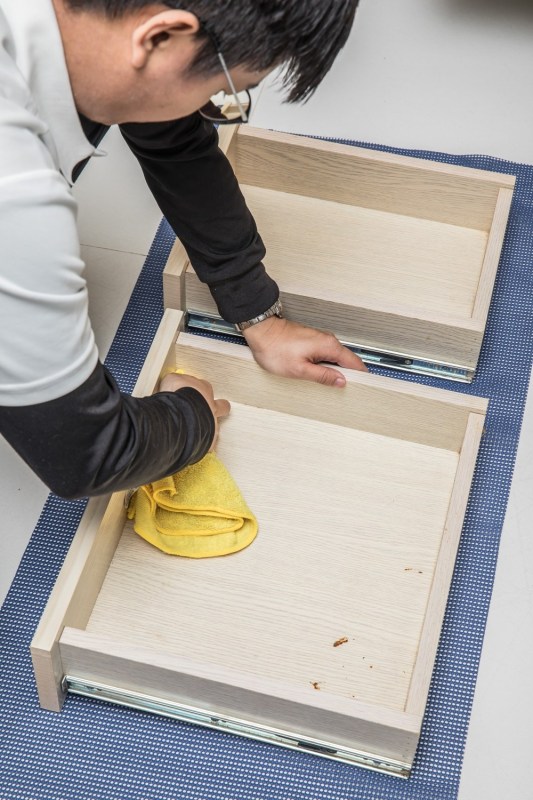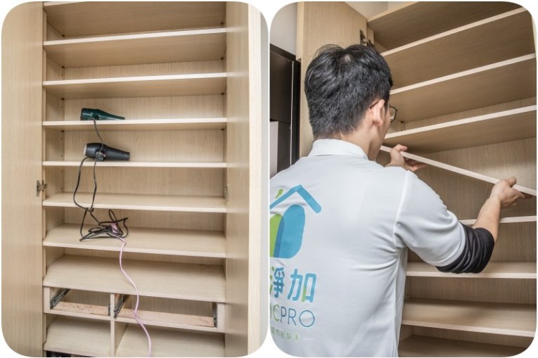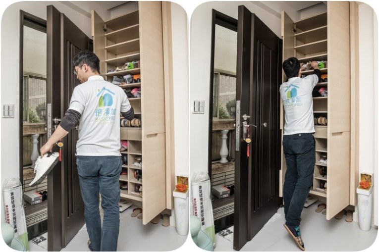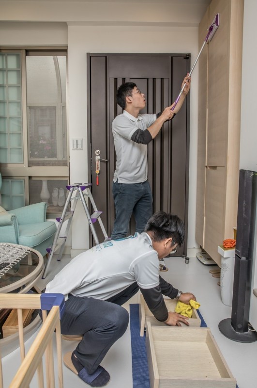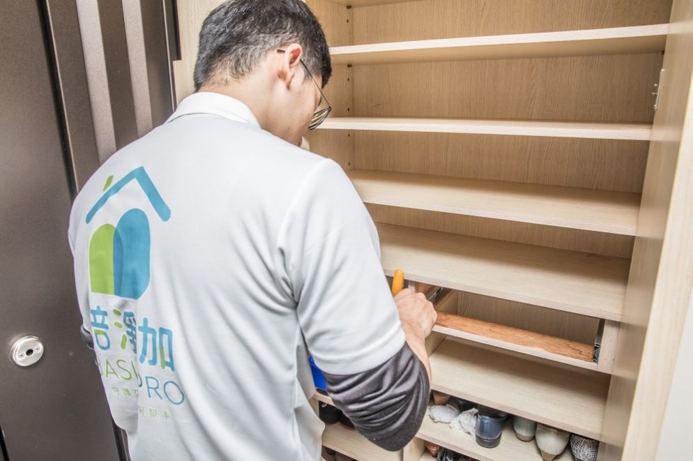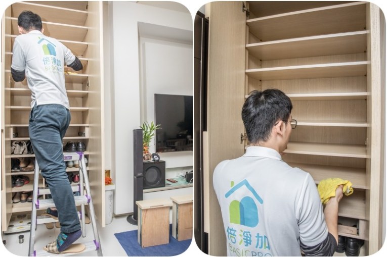 兩人一組,一人清理鞋櫃與門板,另一位則是清理抽屜。