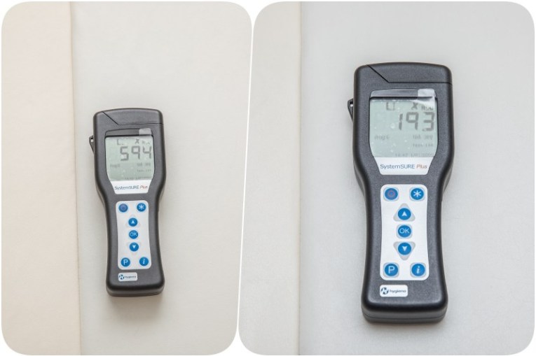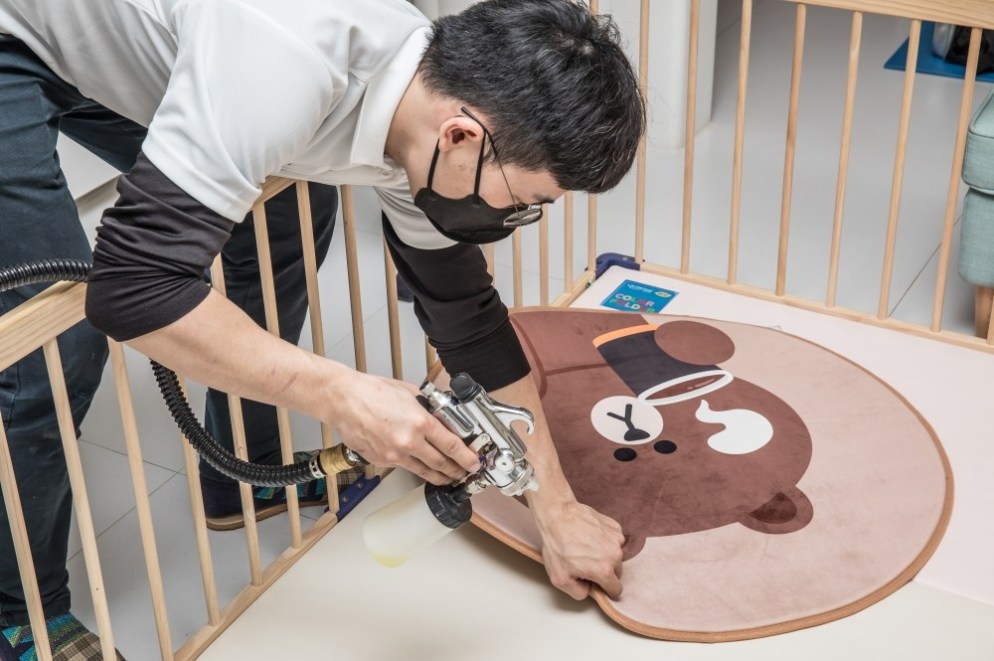 而接下來的抗菌抗病毒施作,其實就是延續除甲醛施作的最後一個步驟,也就是使用新型奈米複合材料噴塗,但在這之前,依舊需要對照與比較,所以施作人員特地在溫溫的遊戲墊上測試細菌數,基本上400 RLU以下是合乎標準,超過就不太妙。