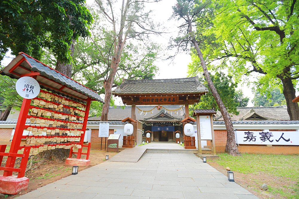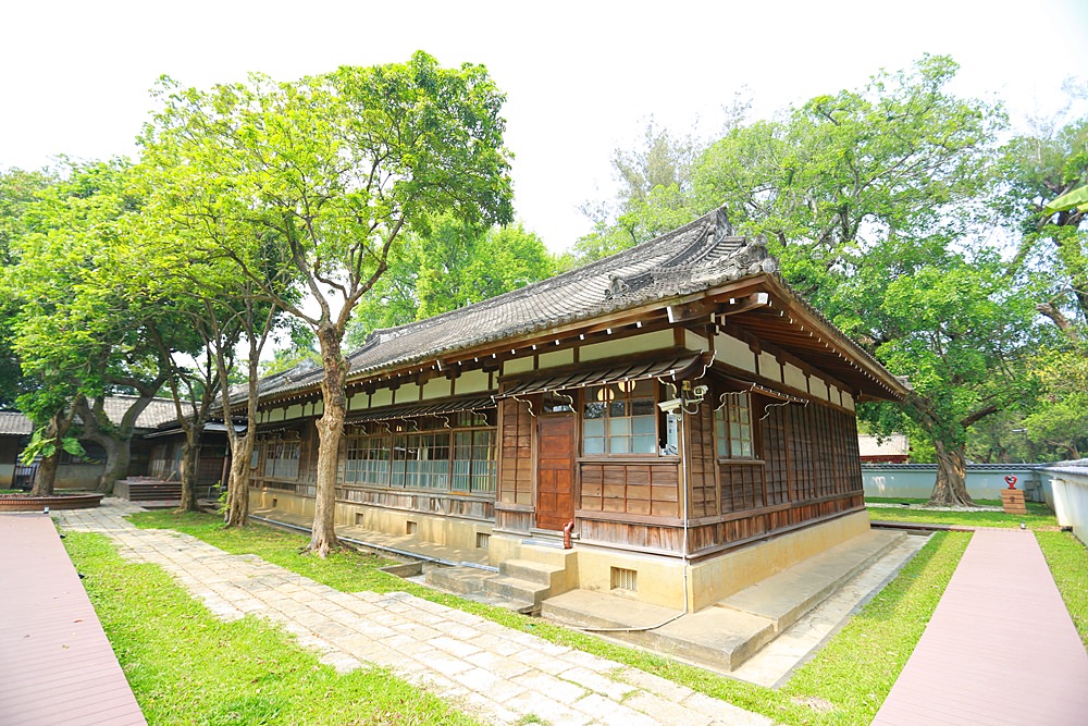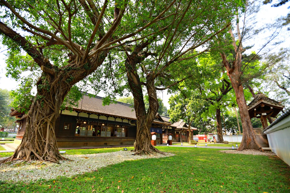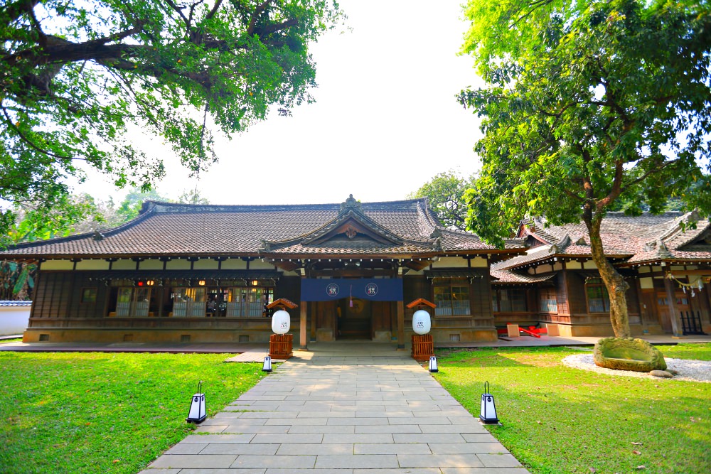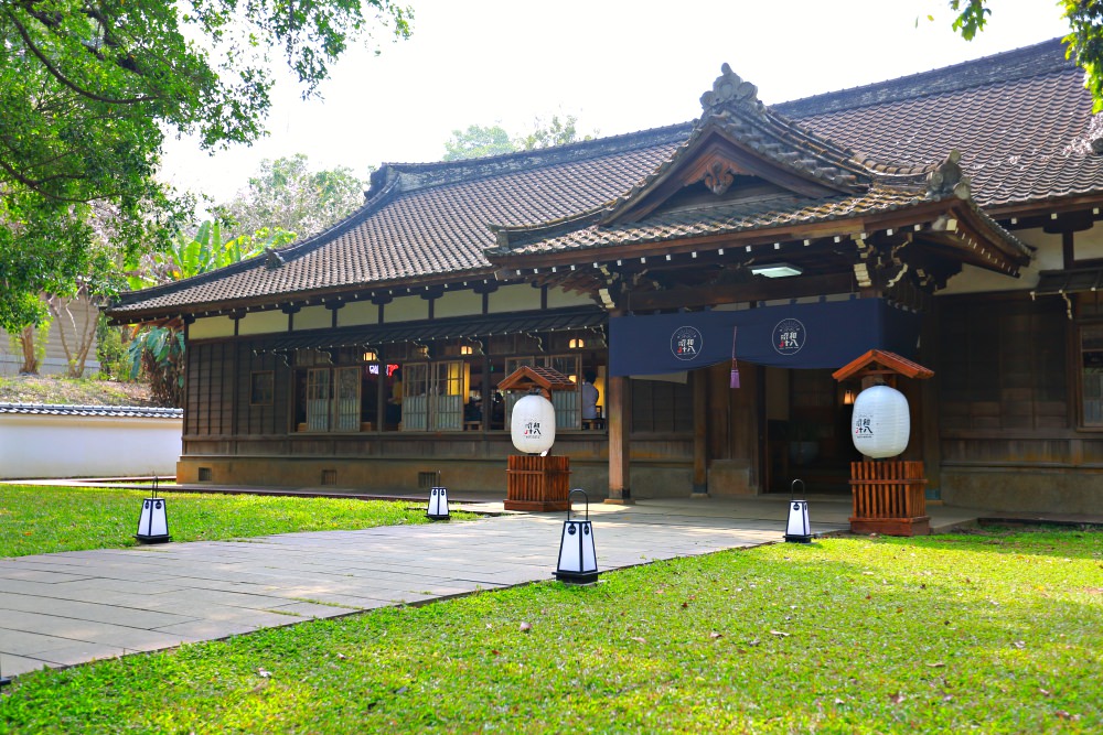 從入口處掛著百片木板的繪馬跟掛著白燈籠的造景,我是來到日本了吧!繼續往前走,裡面綠地草皮和參天大樹圍繞著一棟有歷史的木造屋,眼前老屋讓我很是驚訝,創建於1943年(日治昭和18年),是日式「書院造」木結構建築特色,現在也是市定古蹟喔。
