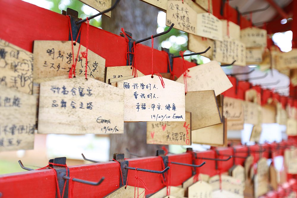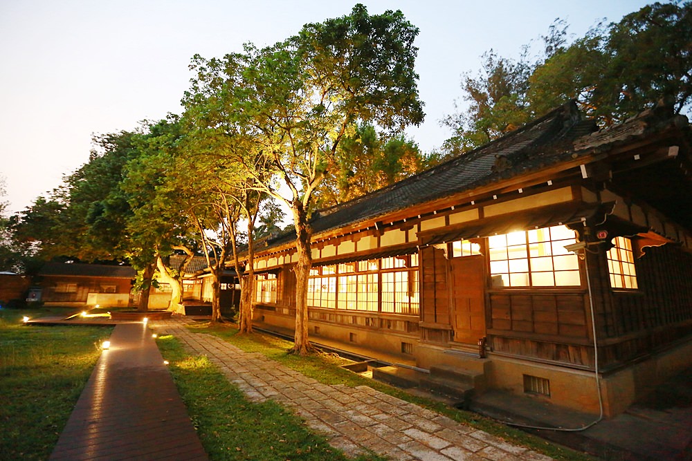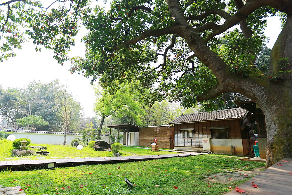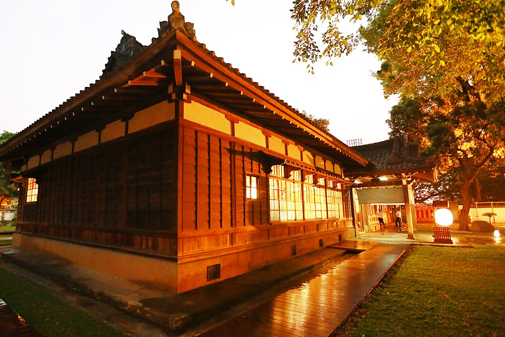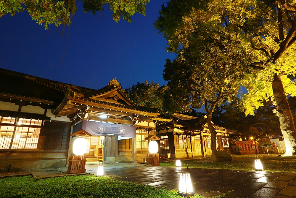 從入口處掛著百片木板的繪馬跟掛著白燈籠的造景,我是來到日本了吧!繼續往前走,裡面綠地草皮和參天大樹圍繞著一棟有歷史的木造屋,眼前老屋讓我很是驚訝,創建於1943年(日治昭和18年),是日式「書院造」木結構建築特色,現在也是市定古蹟喔。