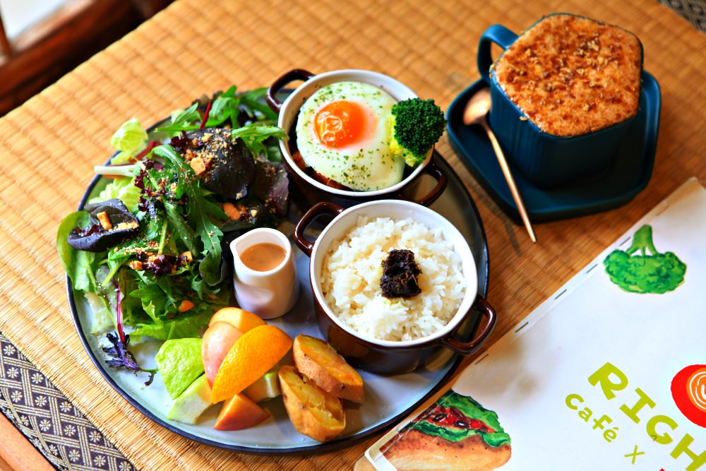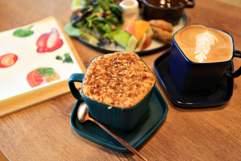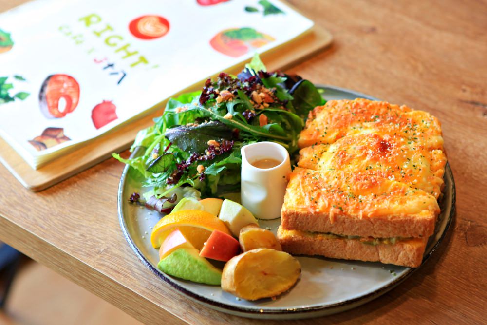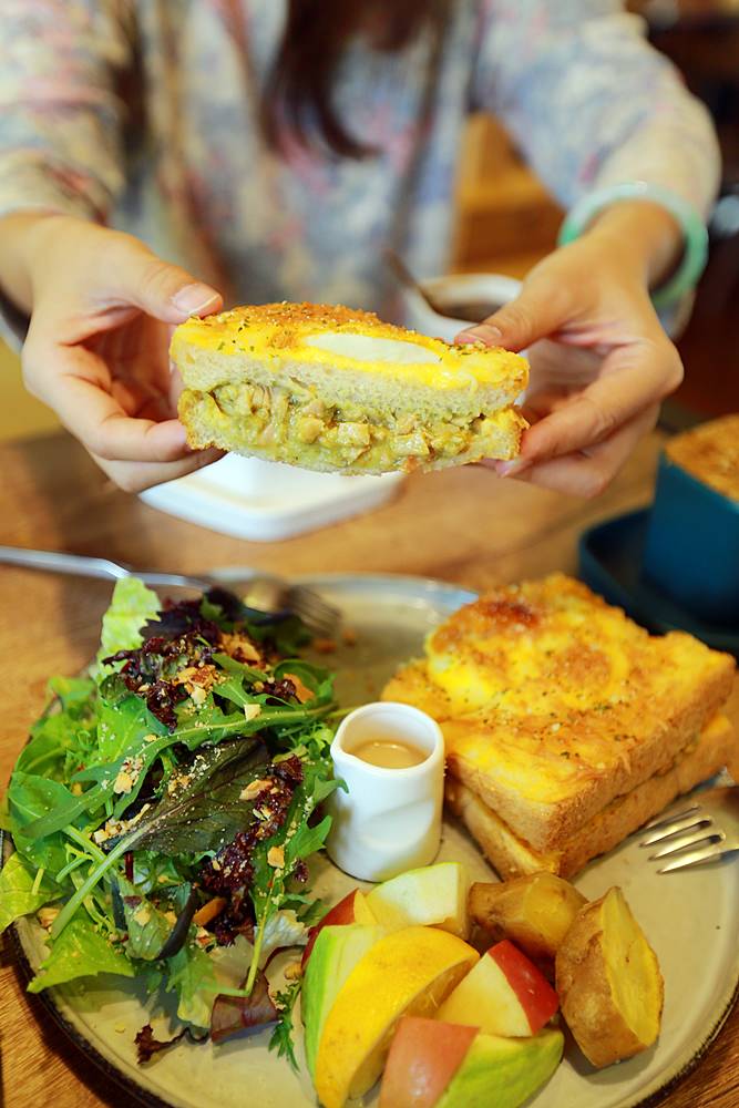 飽足感十足的金黃色土司,中間夾餡是青醬雞肉,吐司上面打了雞蛋一起焗烤,配上時令水果跟生菜沙拉、蒸地瓜,不僅兼顧美味也吃的滿足。