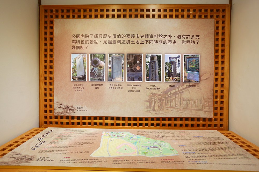 百年歷史的嘉義公園創立於日治時代明治43年(1910年),在過往曾經是戰略要地,因此擁有豐富的文史寶藏,像是乾隆皇帝御製滿漢雙文合壁的石碑、嘉慶年間的水師大砲、全台首座地震紀念碑、日治時代神社的附屬館所、十九世紀初由美國製造的阿里山蒸氣火車頭…都散布在嘉義公園內。