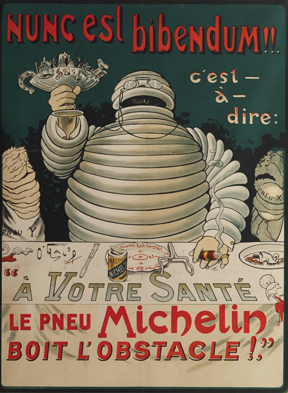 Bibendum 其實是我們很熟悉的人物,他就是米其林輪胎最為人所知的白色輪胎人,Bibendum 就是他的名字。他是在 1894 年時,米其林輪胎創辦人之一 愛德華·米其林 看到展場中的輪胎堆積有如人型而發想後,請畫家繪製他心中的想法成為米其林公仔,當時在宣傳海報上寫著 NUNC est bibendum!(現在就是飲酒的時刻!),原意為飲品或是喝飲品的 bibendum,最後就成為這公仔的名字!