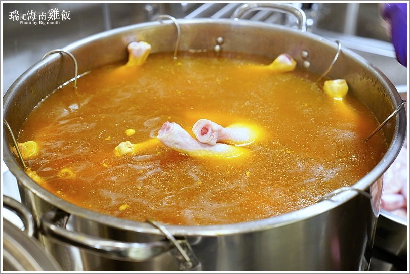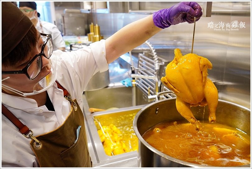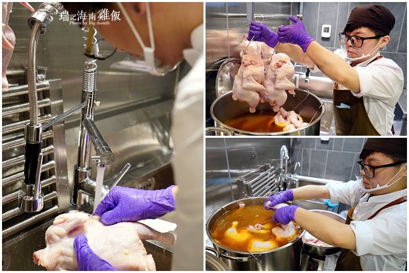 ▼大口運氣很好,剛好看到一鍋正要準備烹煮,一鍋準備要起鍋,就能把製作過程從頭到尾都看了一輪啊!他們家的海南雞都是每日新鮮製作,店家特別嚴選40~60天成長期的雞隻、約2斤多的溫體雞來製作,首先服務人員會先洗雞,把雞隻的內外都清洗乾淨後,再把雞胸下方的油脂拿出來,洗淨稍微瀝乾之後就下鍋開始燜煮啦!