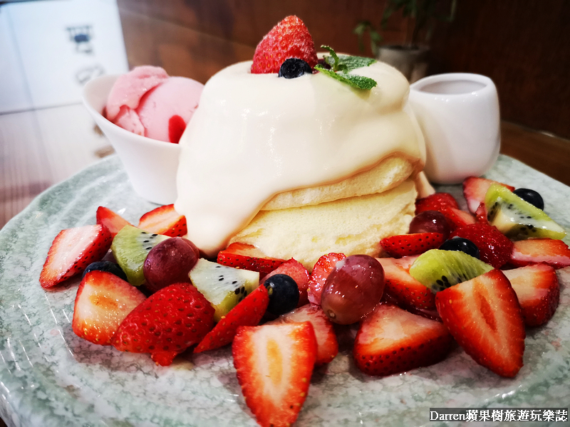 及打勻後的蛋白,舒芙蕾厚鬆餅綿密細緻,入口會慢慢綿化整個有被療癒到,可以搭配水果或冰淇淋都很好吃唷