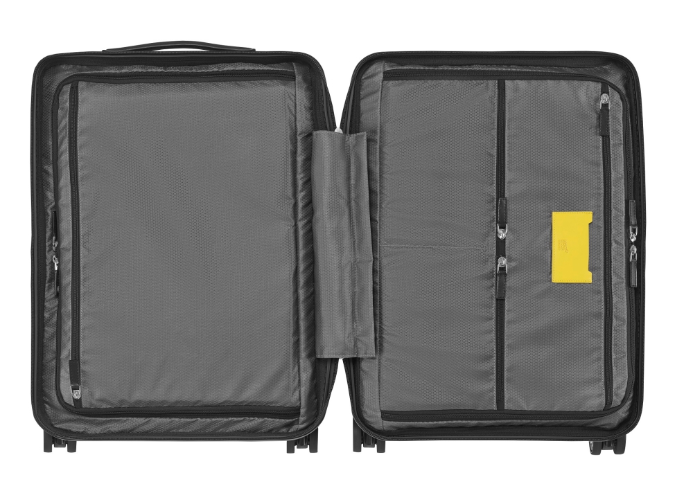 內層儲物規劃:放置衣物的寬大隔層帶、拉鍊閉合裝置、1個大號拉鍊平袋、可放置衣物的拉鍊隔層、1個中號和2個小號拉鍊平袋及名片袋