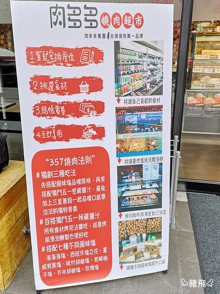 肉多多燒肉超市保留上一家餐廳的裝潢風格,寬敞又挑高的時尚日式裝潢,還有大面落地窗風景,座位間寬敞舒適,服務人員會把剛剛採購的食材擺到桌上讓客人自行烤肉,桌上還貼心的準備燒肉秘笈耶!不會烤肉的打開秘笈就對了,什麼肉類怎麼烤,裡面都有教學喔。