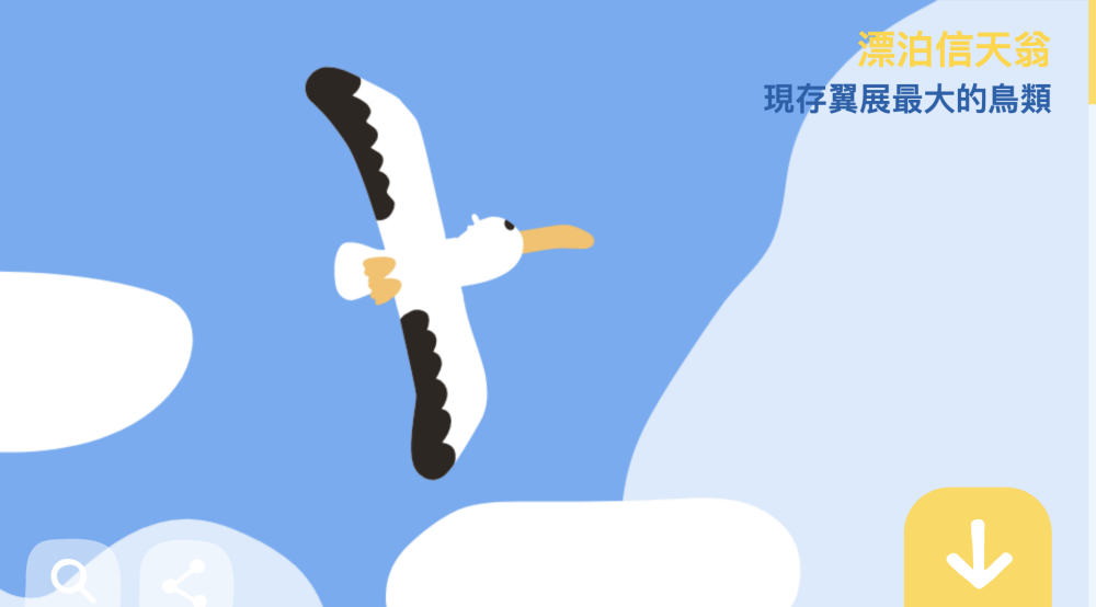 漂泊信天翁生活在南冰洋附近。漂泊信天翁是體型最大的一種信天翁,也是眾多鳥類中,翼展最長的一種鳥,平均達3.1m,最長可達3.7m。漂泊信天翁花很少氣力便可飛行數千公里,其秘密在於牠的身體結構和飛行技巧。