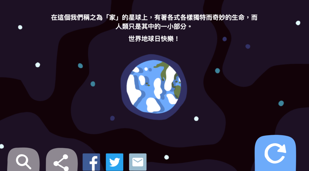 Google 為了紀念 2019 年世界地球日(earth day),4月22日這天特別將換成動畫,來紀念這一天,用腔棘魚、亞馬遜王蓮、海岸紅衫、漂泊信天翁、阿馬烏童蛙等珍奇獨特的動植物,告訴世人,人類只是地球的一小部分。