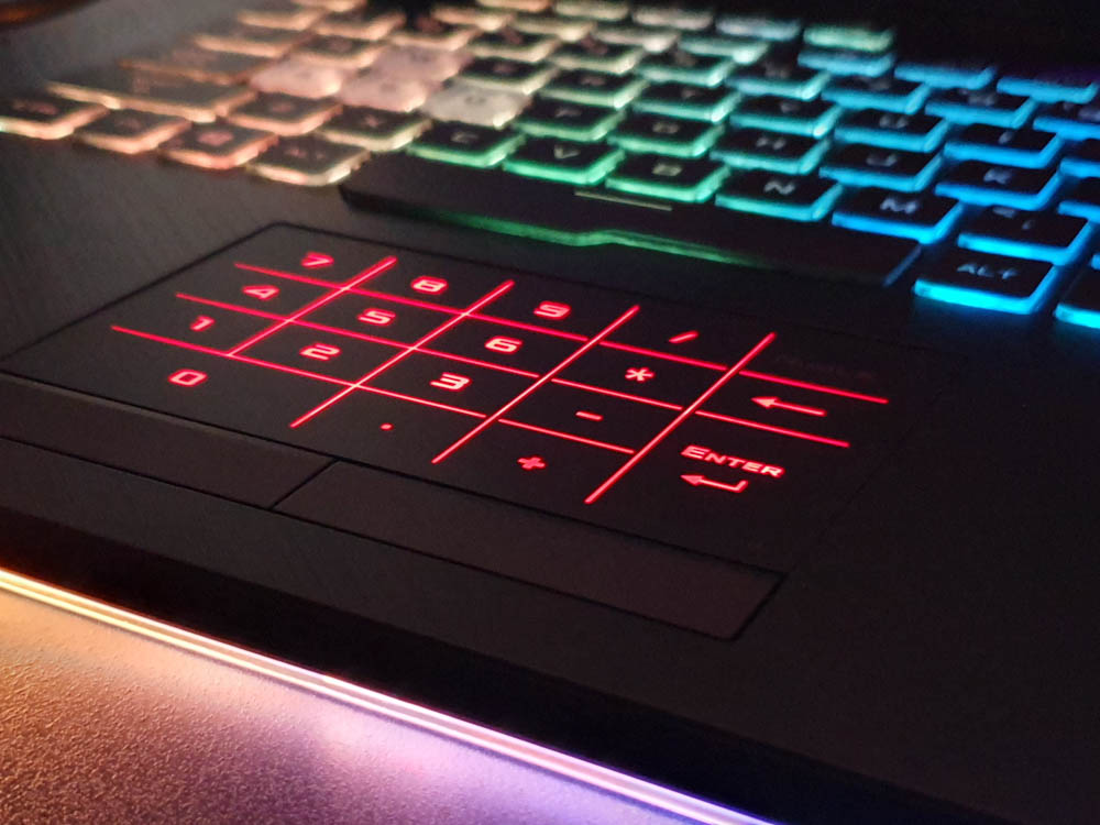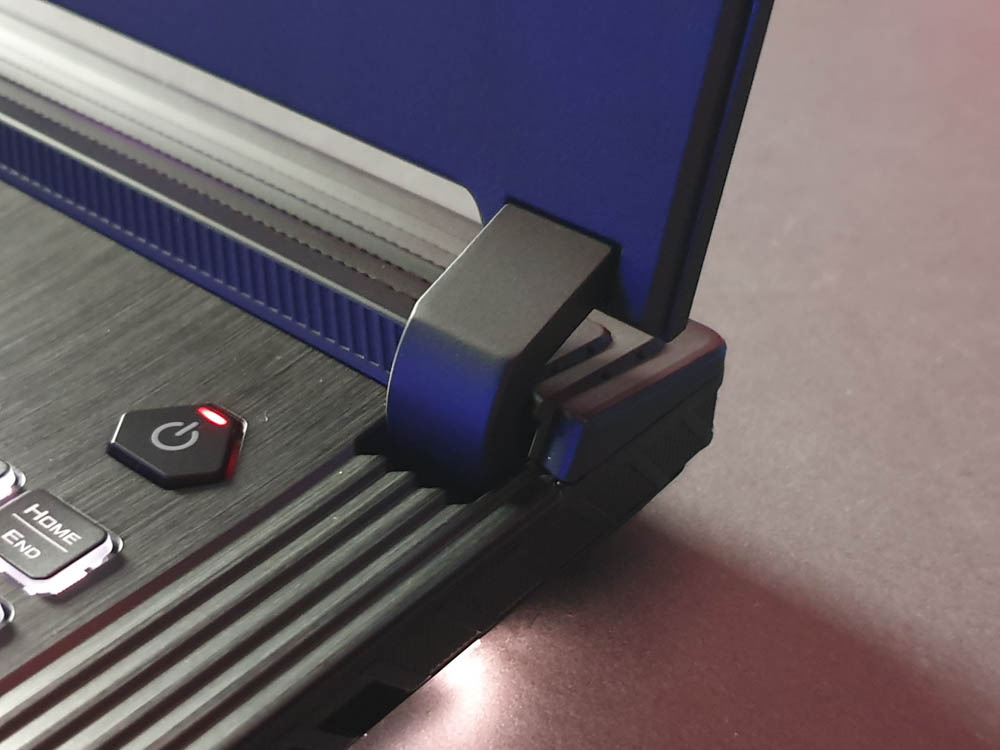 鍵盤配置移除了數字鍵,並將數字鍵放在觸控鍵上(該功能為選配),鍵帽間空隙較寬,打字體驗也能舒適一些,而在 C 面上,ROG 透過層層塗料產生「類碳纖維(3D Carbon Like)」外觀,能夠避免觸碰產生指紋。