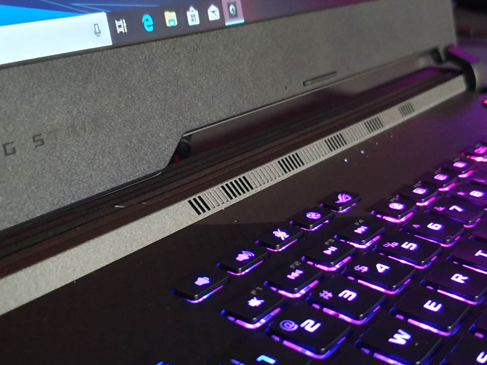 同樣的製車設計理念,在散熱口也能發現,ROG 將它命名為「Flow Tech」;散熱口的外觀採用層層的立體推疊設計,透過這些孔洞增加了 10.6% 進 / 出風量,溫度也獲得改善,加上這次採用了 83 葉面與 12V 風扇,加上風扇自帶的除塵設計,以及 ROG 獨家的 ASS 散熱技術,跟 GL504 相比下降了 2 度,除此之外,在 Turbo Mode 風扇噪音也下降了 2 到 3 dB。