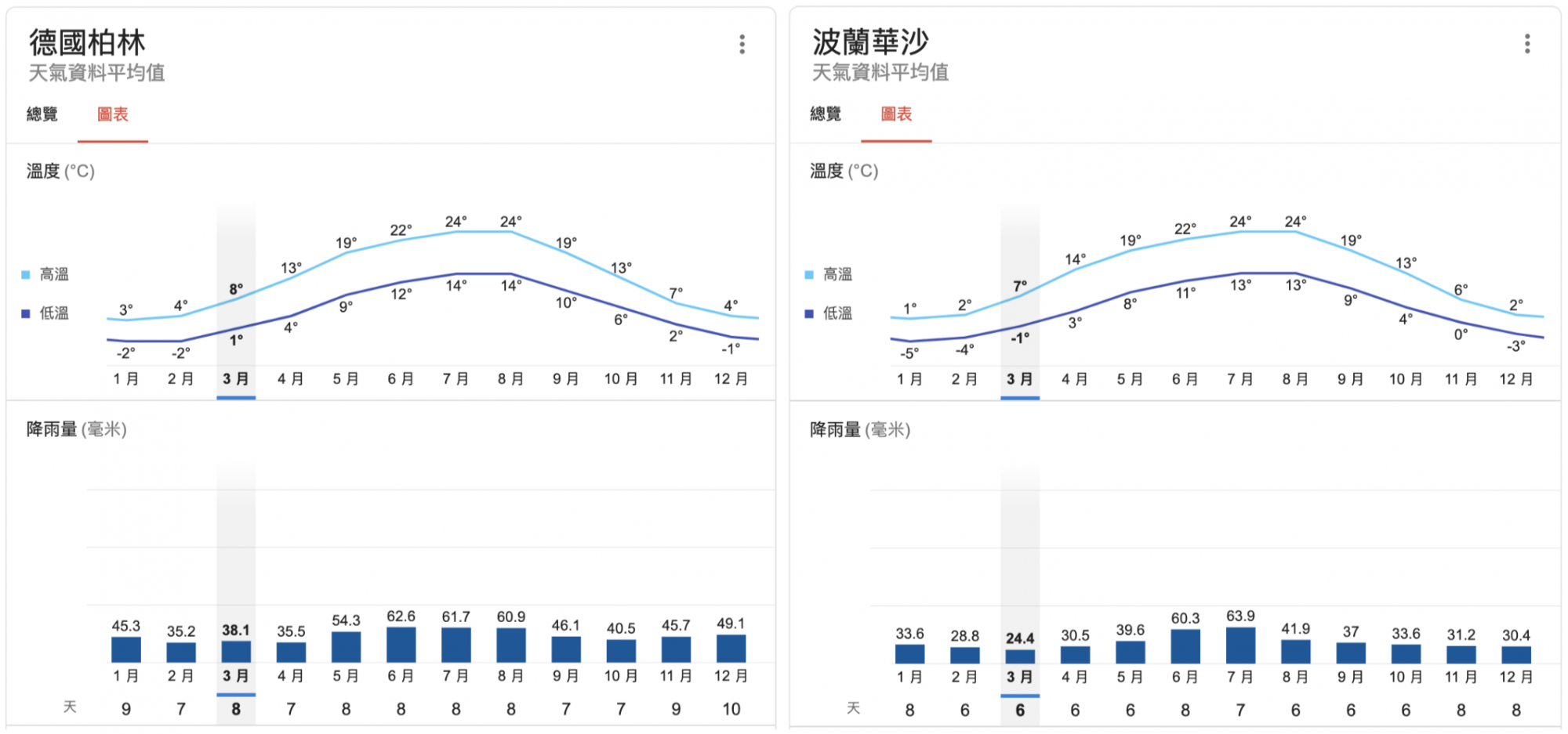 ►時差:德國和波蘭都一樣,3月至10月日光節約時間比台灣慢6小時,其他期間慢7小時。