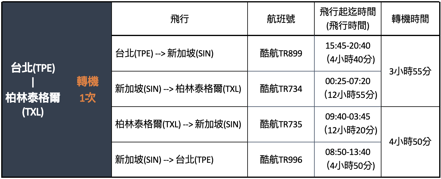 酷航班機時間都是07:20到柏林,台灣起飛時間有蠻多,就看你選要轉機多久;柏林起飛時間則是只有9:40,回台灣時間依轉機時間有11:05或13:40到。(我朋友搭酷航我搭漢莎在香港、慕尼黑轉機這班也不錯啦~只是每段轉機時間都很緊,很像大地遊戲跑到我往生)