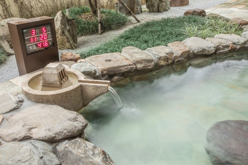 再往外走,就是有種戶外泡湯感的半露天泡湯池,在這裡感受屬於碳酸氫鈉氯化物泉的員山溫泉(水溫約37-45℃,酸鹼值約為pH 8.5),真的會有一種放鬆至極的感受