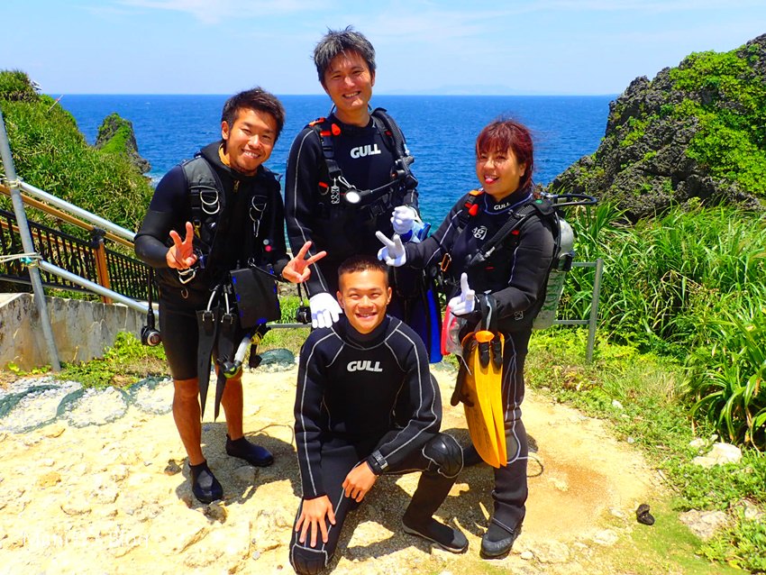 第三天一大早天氣大好,海面上雖然有些波浪,但經教練評估並不影響潛水,總之兩個旱鴨子把這輩子第一次的潛水體驗獻給沖繩最美的真榮田岬青之洞窟(藍洞)啦~