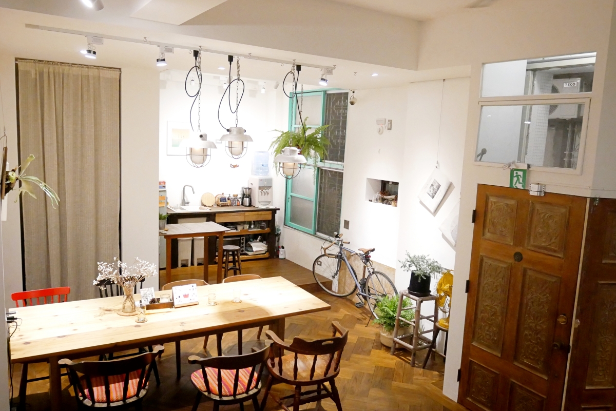一樓有茶水間、交誼空間,茶水與旁邊的零食都是免費供應,若有使用杯碗也要自己清洗晾乾。中間的大桌子可以用餐,那天晚上我們外帶了超好吃的友愛鹹酥雞與旁邊好喝的凍檸茶回來當宵夜,十分愜意舒爽,聊天聊到累了才上樓洗澡準備睡覺。