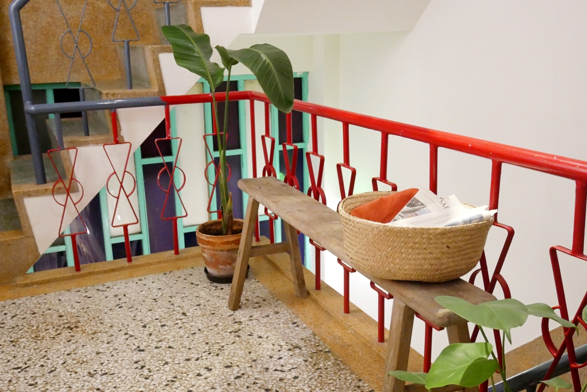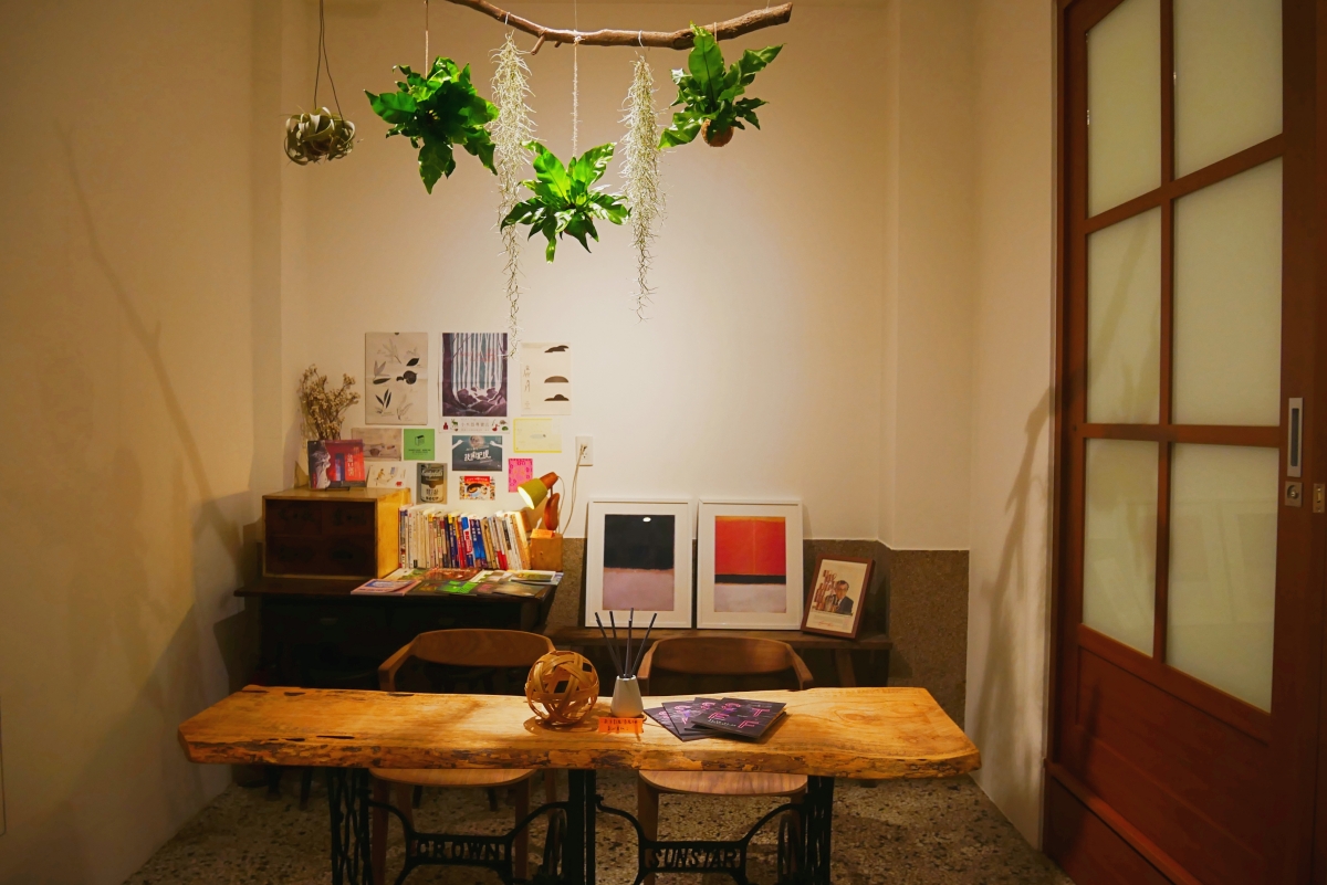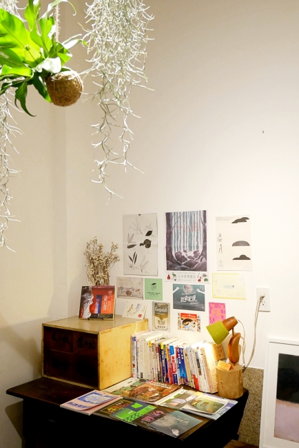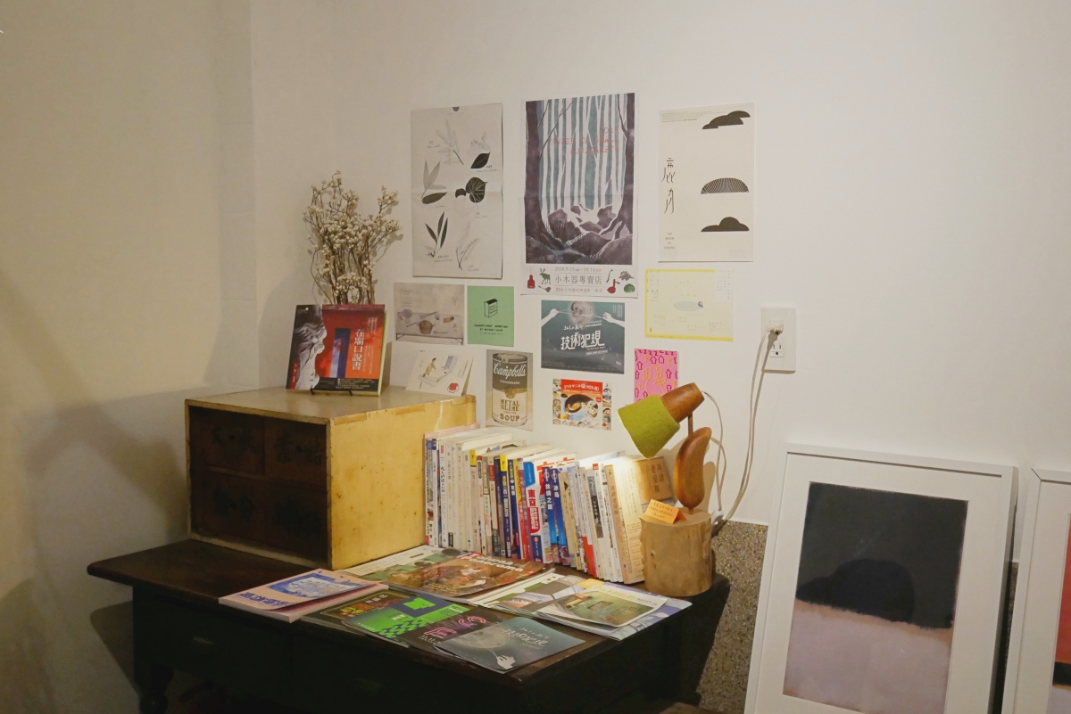 房間外的空間一樣擺了張桌子,擺了些藝文資訊,後方也有書籍和掛畫。主人 Coco 對藝文活動很有興趣,印象很深刻的是那天她接待完我們以後,晚上11點要和朋友去看「大象席地而坐」,片長近四個小時,打算通宵不睡覺的去看電影,非常熱血啊!