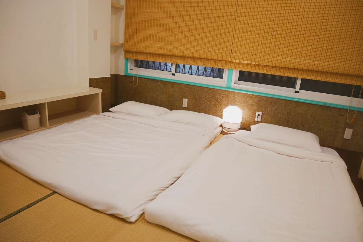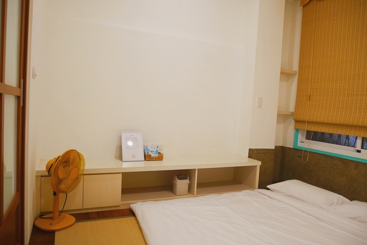 和式空間設計,榻榻米上鋪床墊,簡約的空間,還蠻適合姊妹出遊~我們三人在那玩得不亦樂乎,開開心心的!房間內有提供衛生紙、小垃圾桶,一面大衣櫃、正負零的電風扇。