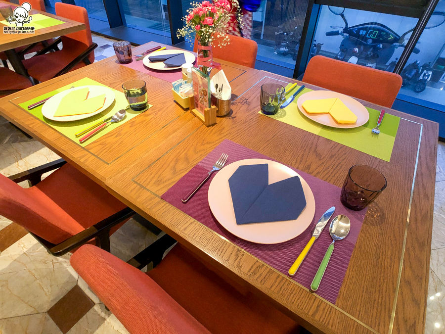桌上放是的餐具也很繽紛,一整個就很活潑帶有趣味性
