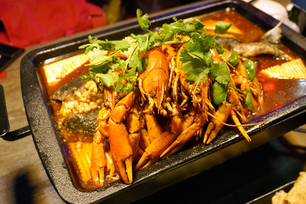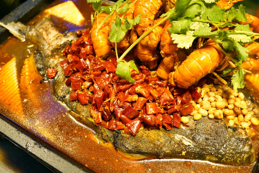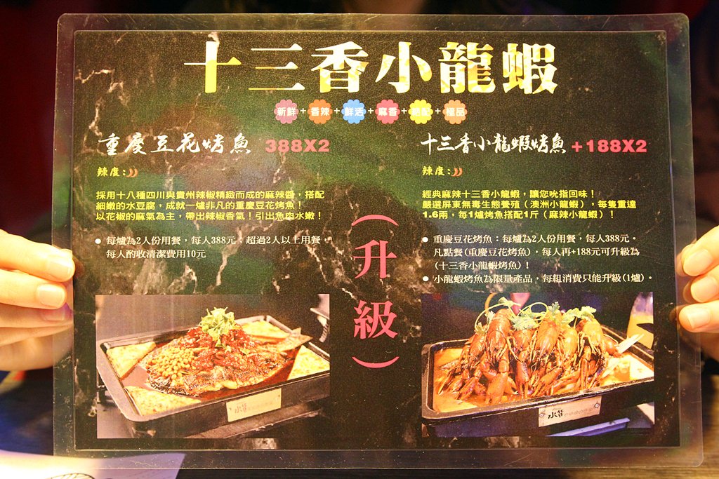 加價升級十三香小龍蝦,看起來相當霸氣,使用屏東無毒生態養殖的澳洲小龍蝦,每隻重達1.6兩,每爐有1斤小龍蝦+1尾重慶豆花烤魚,又稱怪獸級的麻辣小龍蝦烤魚。