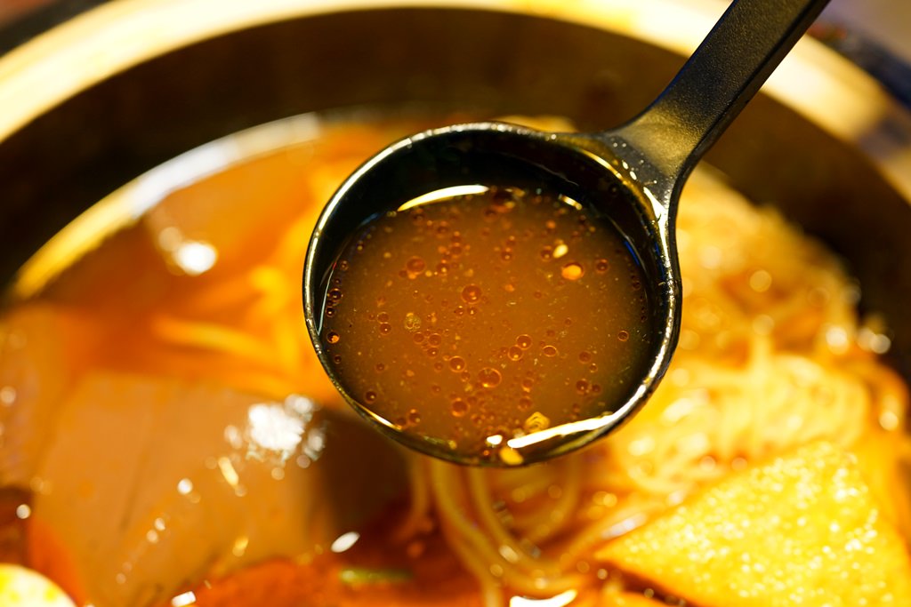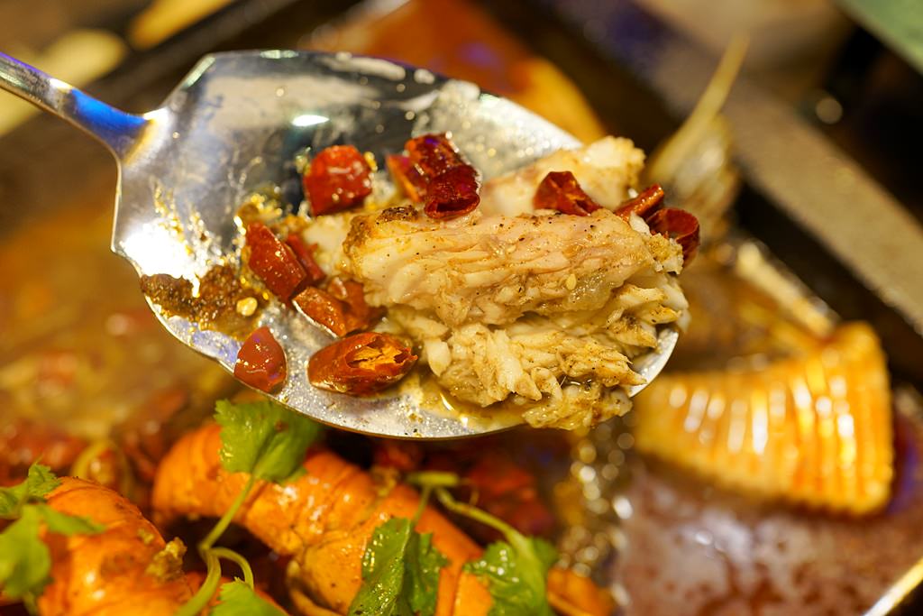 這道基底為重慶豆花烤魚,採用18種四川與貴州辣椒熬製而成的麻辣醬,搭配細嫩的水豆腐,以花椒的麻為主,帶出辣椒香氣。烤魚火鍋可選擇辣度:四川原味/台灣一般/年長薄鹽,我們選了台灣一般,比較符合台灣人能接受的辣度。