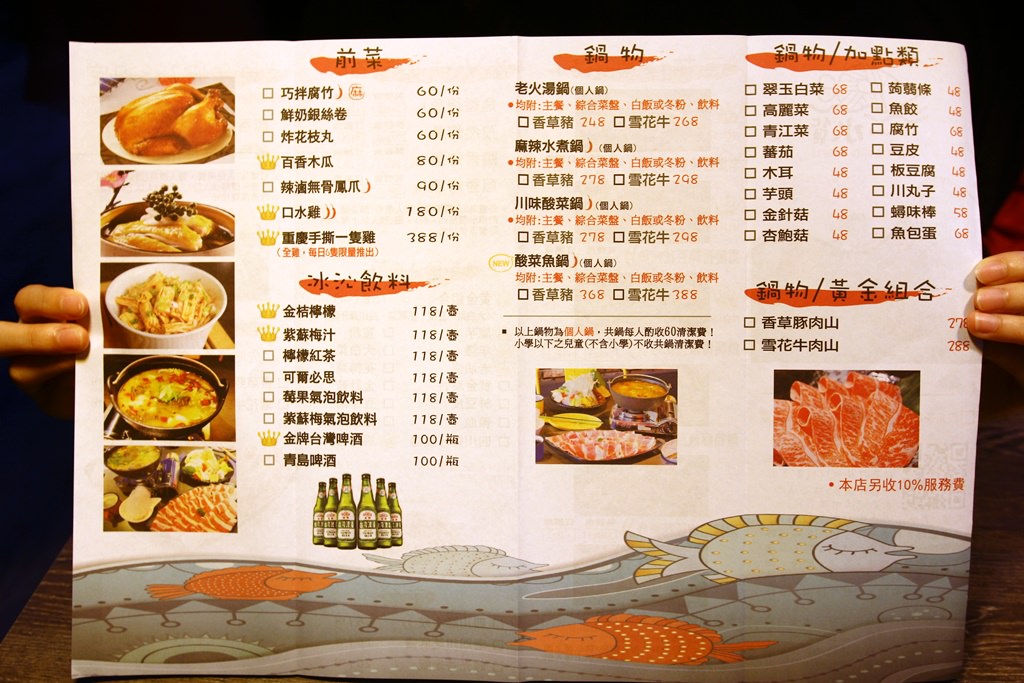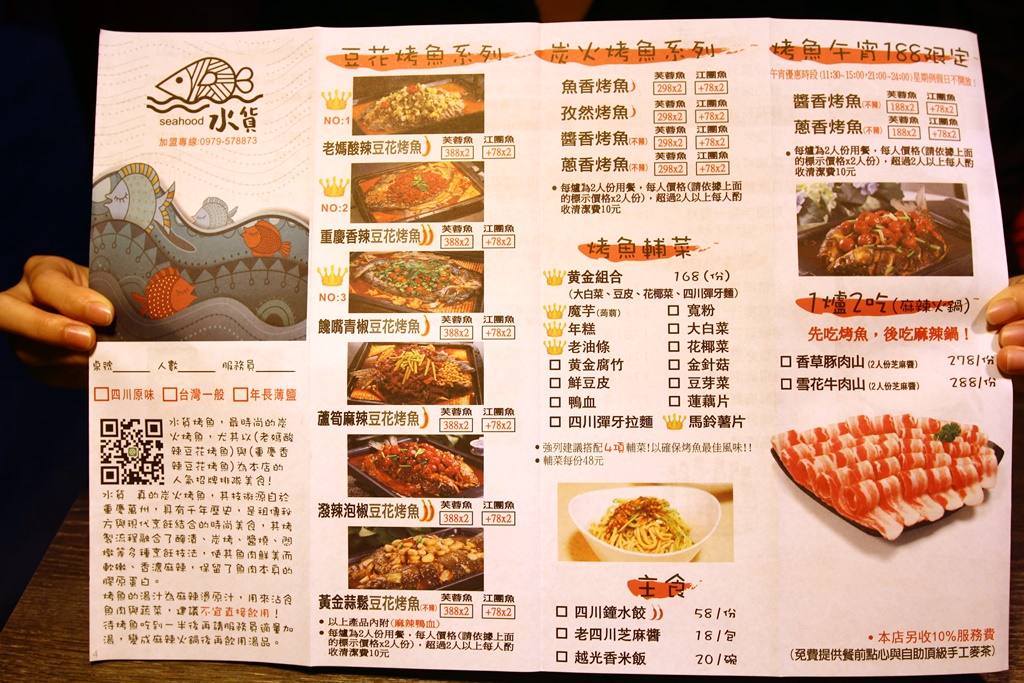 提供豆花烤魚系列、炭火烤魚系列、烤魚輔菜,前菜、個人小火鍋、飲品等,價格還蠻合理的,還有【烤魚午宵188限定】,早來晚來都划算。