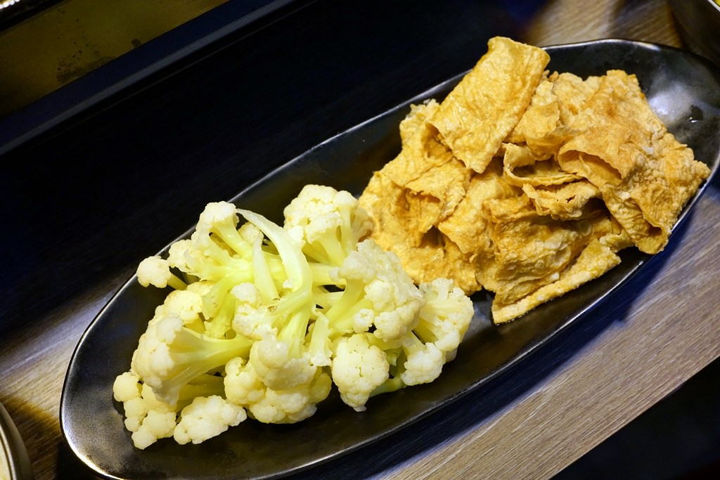 包含四川彈牙麵、大白菜、豆皮、白花椰菜,烤魚火鍋建議搭配4項輔菜,能讓烤魚維持最佳風味,點黃金組合就剛好四樣,各自扮演好角色、缺一不可,四川彈牙麵跟讚岐烏龍麵一樣滑溜順口有彈性,好吃。值得一提的是,每樣輔菜都已川燙熟,直接單吃也行,像我孩子無法吃辣,我就讓他吃白飯、白麵加菜吃。