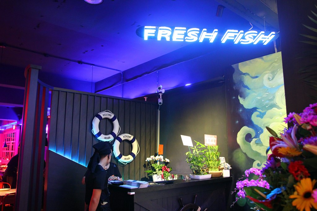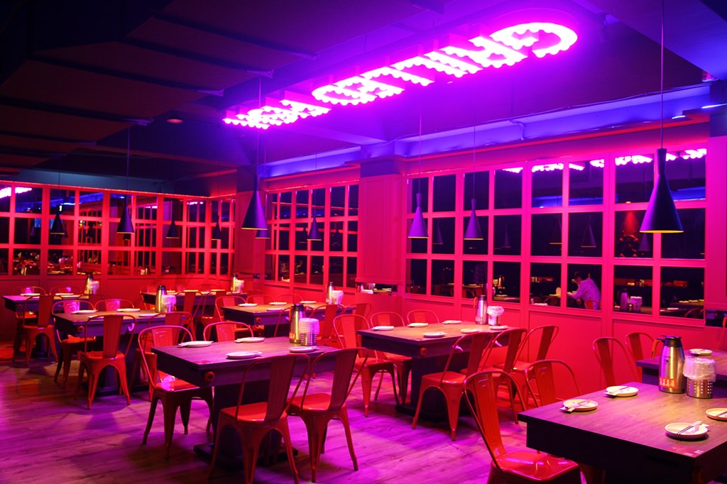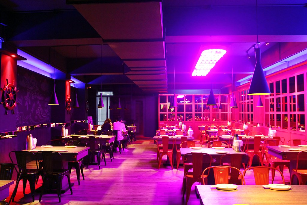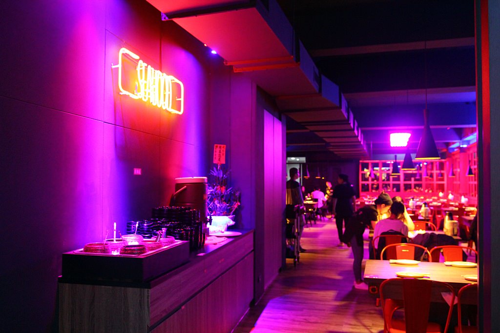 其實炭火烤魚在重慶已有千年歷史,為了賦予它時尚的元素,為了顛覆一般人對大陸餐飲品牌與老川菜館的傳統形象概念,於是店家融合時尚、年輕、燈光、音樂,結合工業風的設計,在燈光的搭配之下,有一種置身夜店的氛圍且空間寬敞舒適。