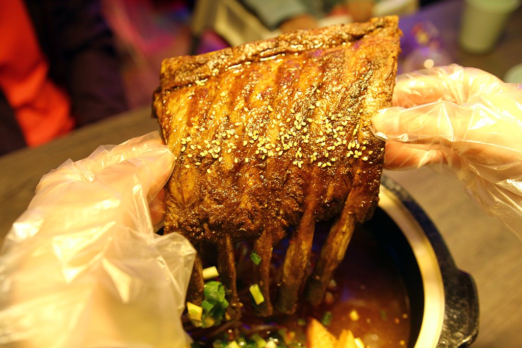 臉盆麵上方擺著份量十足的碳烤豬肋排,豬肋排經過長時間滷製,味道鹹香入味,加上炙燒過的香氣,吃起來微焦富有嚼勁,單吃豬肋排會有微微的香辣,但不會很辣,麻辣的部分主要在下面的湯頭跟麵…
