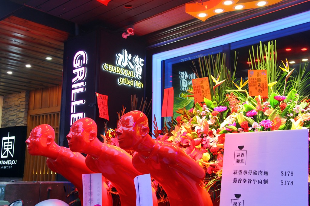 水貨烤魚火鍋每間分店都會有的迎賓人形公仔好逗趣,可惜人形公仔前面停滿機車,沒機會合照留念。