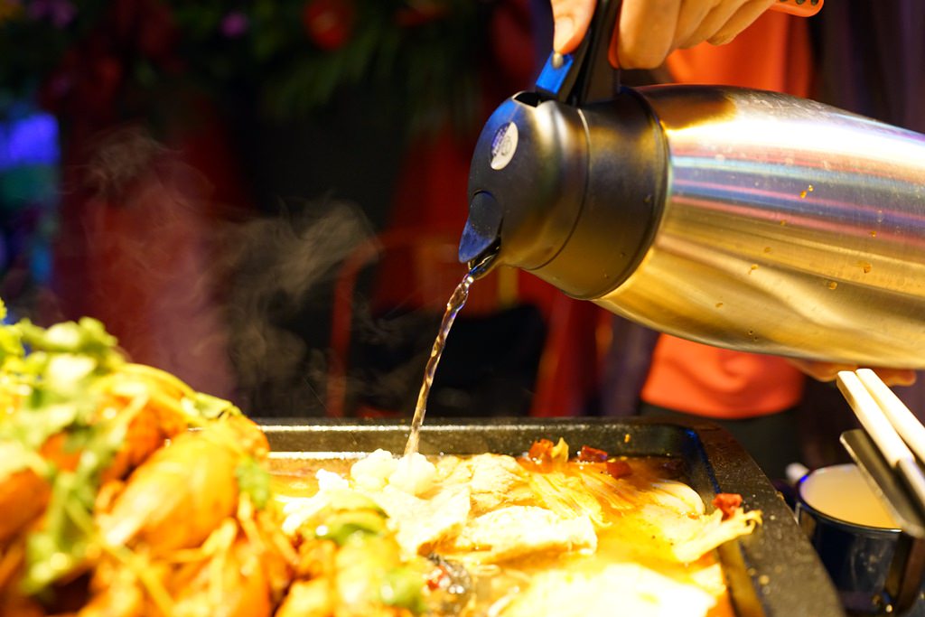 店員建議湯底高度不可低於鍋身一半,避免食材烤焦。