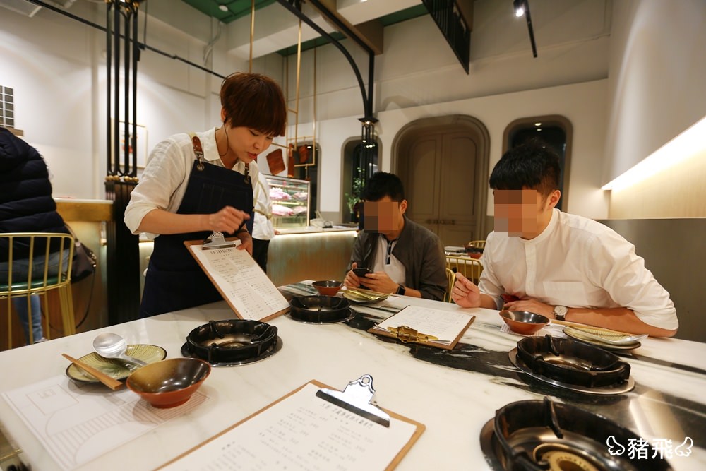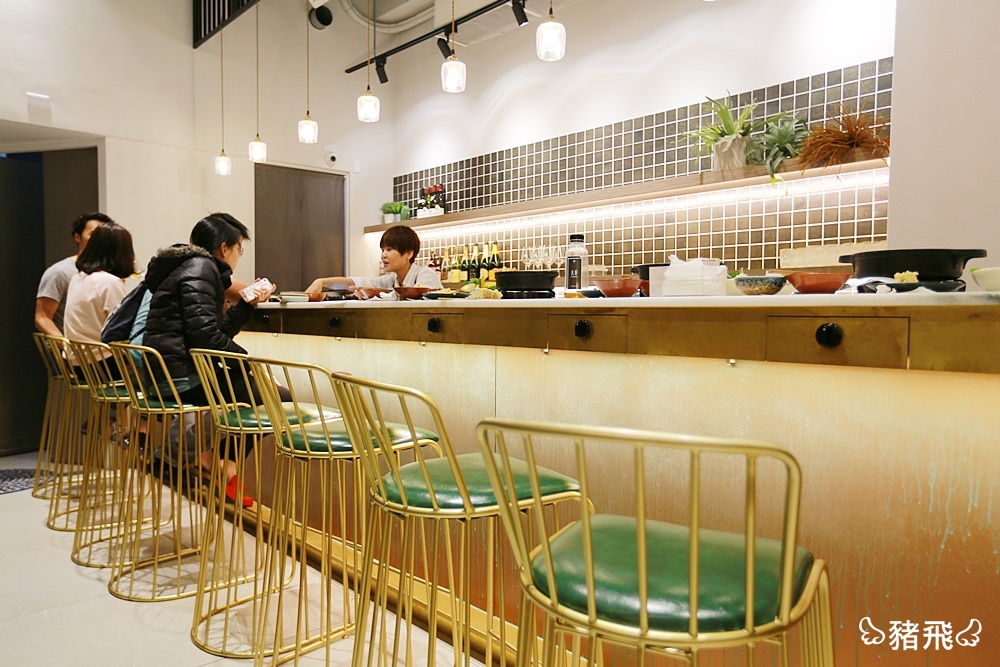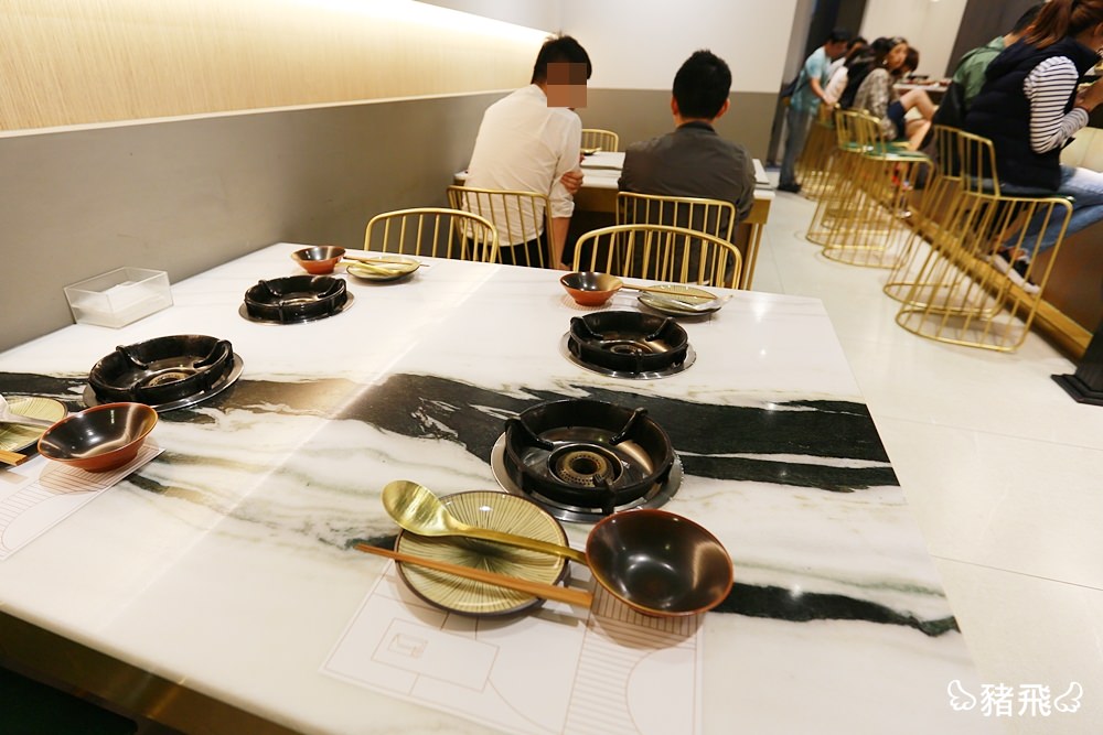 從進門開始我都以為走進咖啡廳了,從吧檯的金色系、黑色系鐵架到延伸過去的大理石檯面還有高掛的吊燈,設計感十足,跟一般火鍋店充滿各種湯底氣味、霧氣瀰漫的感覺大不同,在這裡吃火鍋還能保持一身優雅,就如同喝咖啡一樣舒服自在,難怪幾乎都是正妹客人。