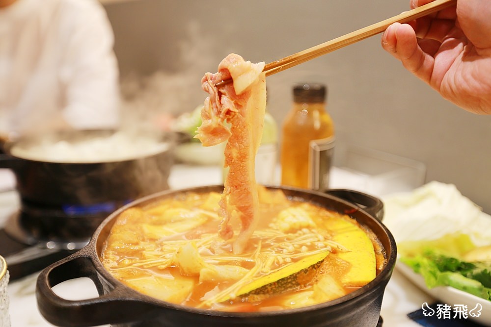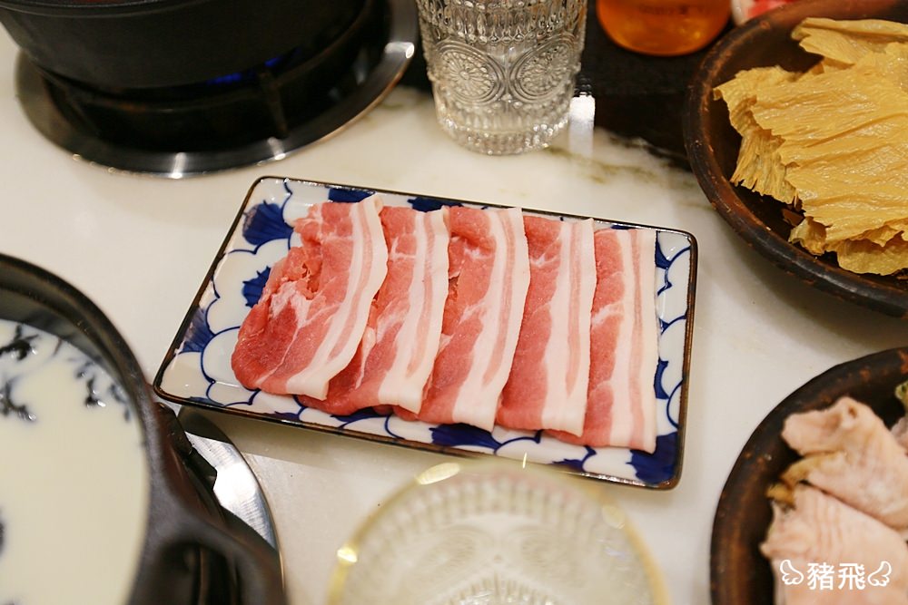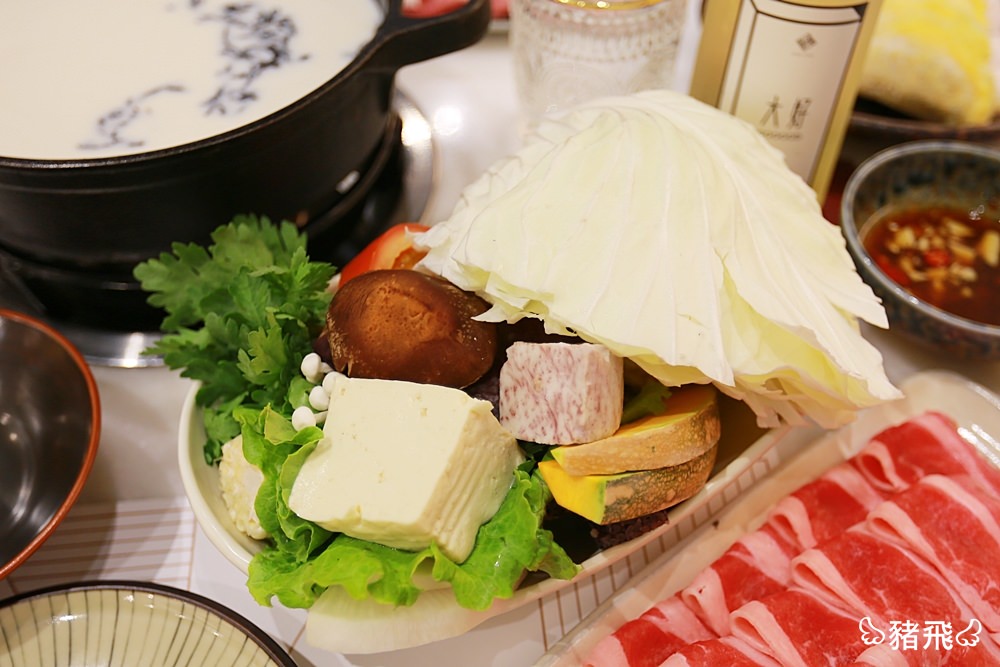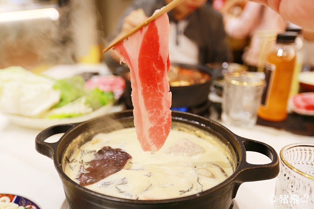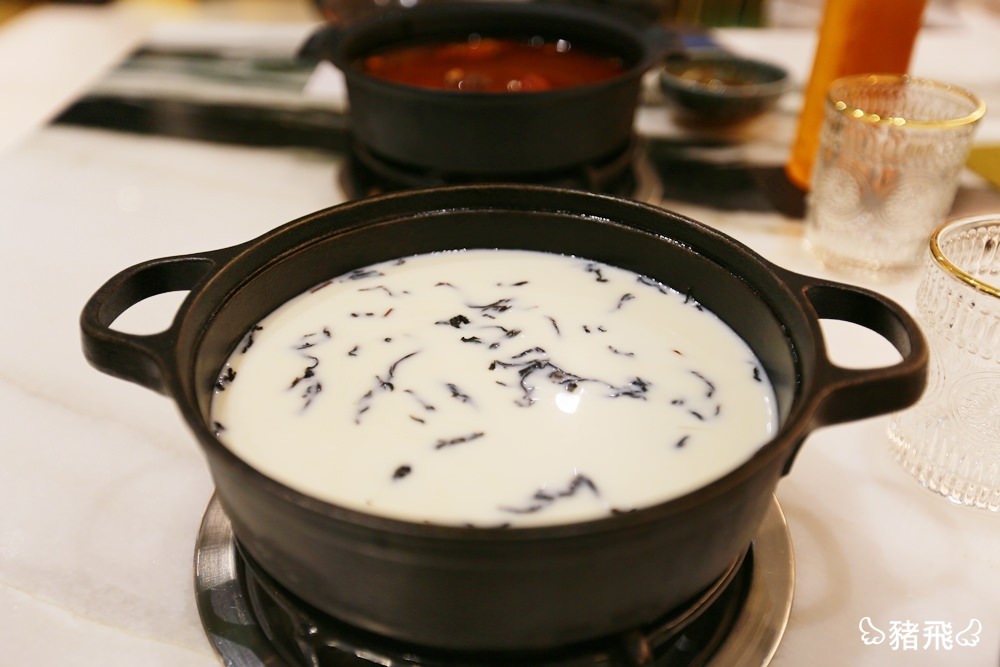 看著火鍋煮沸的過程就像看一場秀,當精選的阿里山原葉紅茶葉在鍋裡盡情伸展,茶湯與牛奶混合漸漸地茶香四溢,茶葉恰巧去除了油膩感,介於清爽與濃稠間的奶茶鍋湯頭是微鹹奶香與起司滋味,喝起來記憶深刻,肉片在奶茶鍋裡涮個五秒鐘呈現粉嫩嫩色澤入口即化。
