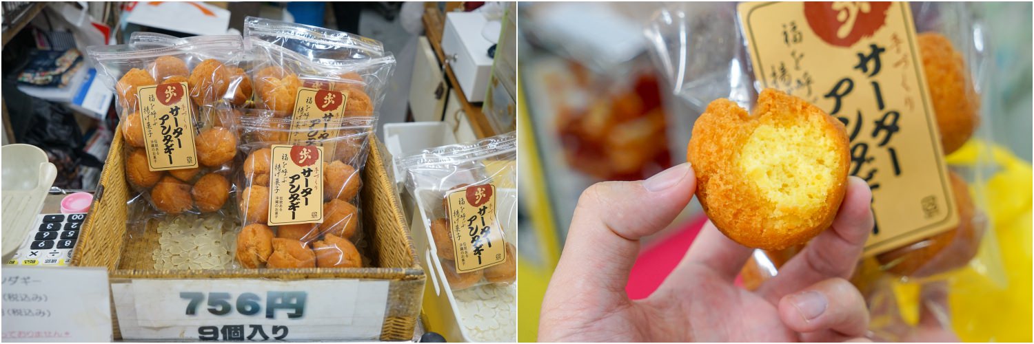 步沙翁是一款沖繩傳統的小點心,作法是把糖、麵粉和雞蛋融合,在放下油鍋裡炸,用黑糖就叫黑沙翁,用白砂糖就被叫做白沙翁,我是覺得吃起來蠻像硬一點的甜甜圈,外型比較像是開口笑,其中位於牧志市場二樓這家老店口味極好,日本媒體甚至給了「沖繩第一夢幻沙翁」這樣浮誇的稱號。