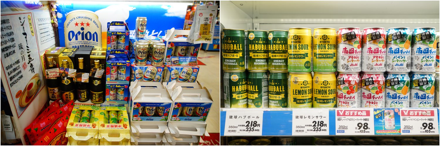 沖繩啤酒最普遍的是Orion啤酒,大概就等於台啤在台灣的程度,不管拿來配烤肉、配串燒、配零食都超棒,冰涼舒爽很順口,值得一試。另外還有更在地的苦瓜啤酒,別擔心,喝起來沒有苦瓜味,不過味道比Orion強烈些。而超市中也可以買到兩款Asahi沖繩限定水果酒(香檸櫻桃、香檸鳳梨),也很好喝呢。
