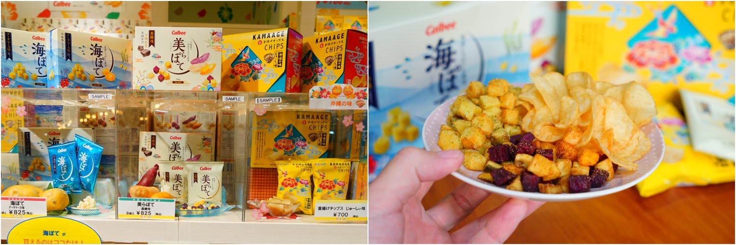 Calbee 最有名的肯定就是薯條三兄弟,而Calbee也推出好幾款沖繩限定商品,其中以地瓜+沖繩黑糖製作的三色薯塊和Royce石垣鹽巧克力洋芋片超級熱賣,各種口味可以單獨買,也有比較便宜的組合包,推薦大家可以在Calbee+沖縄国際通り店入手。