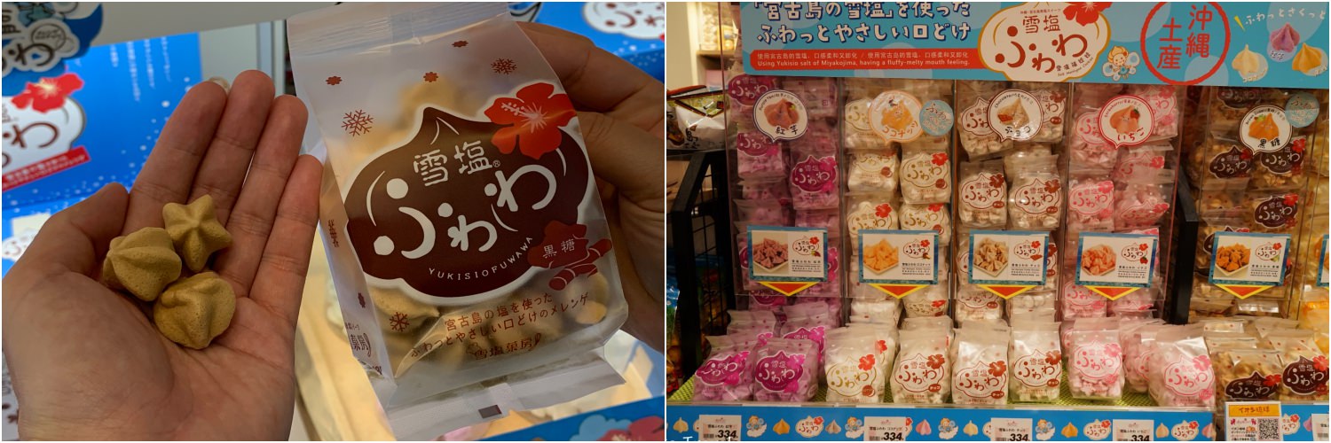 有一罐罐賣的雪鹽調味料,也有以雪鹽製作的像是金楚糕、棉花餅等零嘴,其中棉花餅很厲害,入口即化鹹鹹甜甜,有黑糖、紅芋、椰子三種口味,是來沖繩必買的特色土產,推薦大家可以在鹽屋 – 國際通店入手。